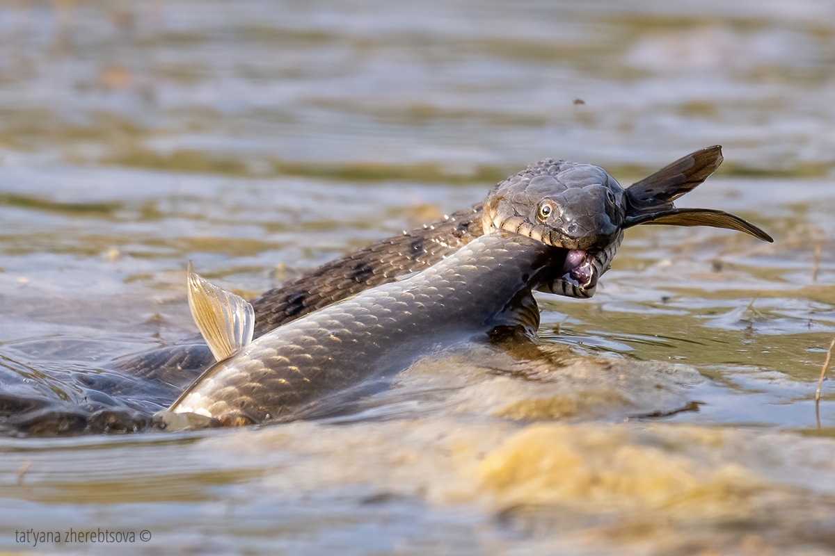 Водяной уж с добычей. Змея не сильно большая, но на фото выглядит как анаконда..