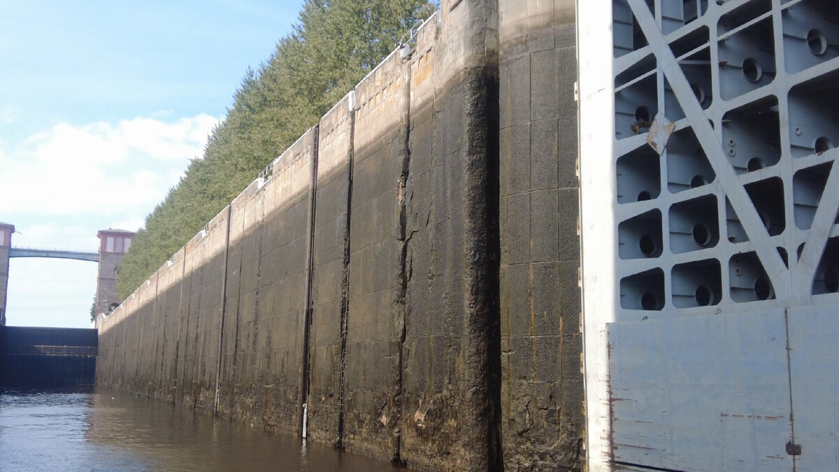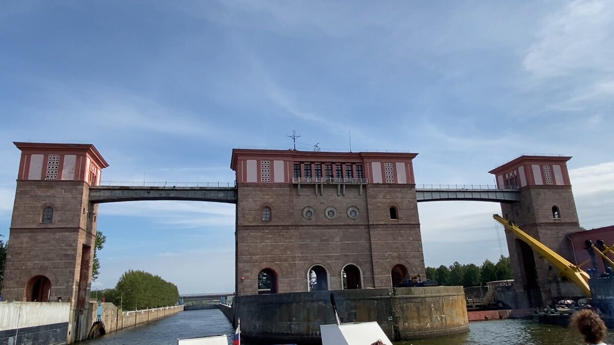 Здесь видна наша камера, вода в которой 10 минут назад была на одном уровне с Волгой, теперь на одном уровне с Рыбинским водохранилищем.