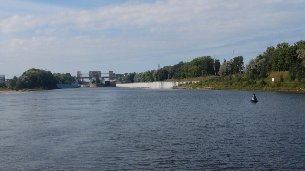 После выравнивания уровня воды и опускания ворот, мы наконец выходим в Рыбинское водохранилище. Вот так выглядят шлюзы уже со стороны водохранилища