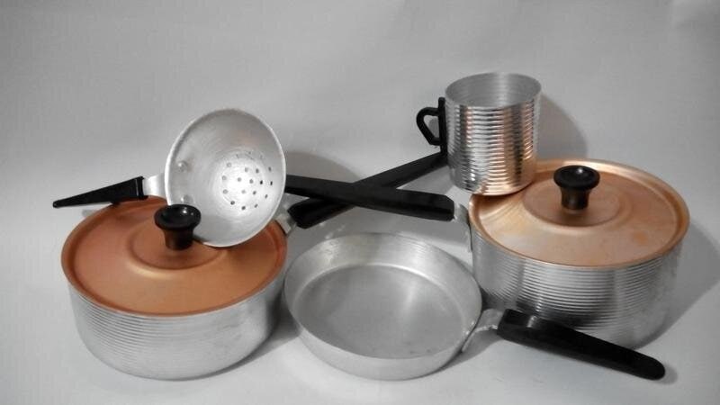 В советское время - это была точная мини-копия "взрослой" кухонной утвари. Она была простой и незамысловатой, изготавливалась из пищевой дюрали.