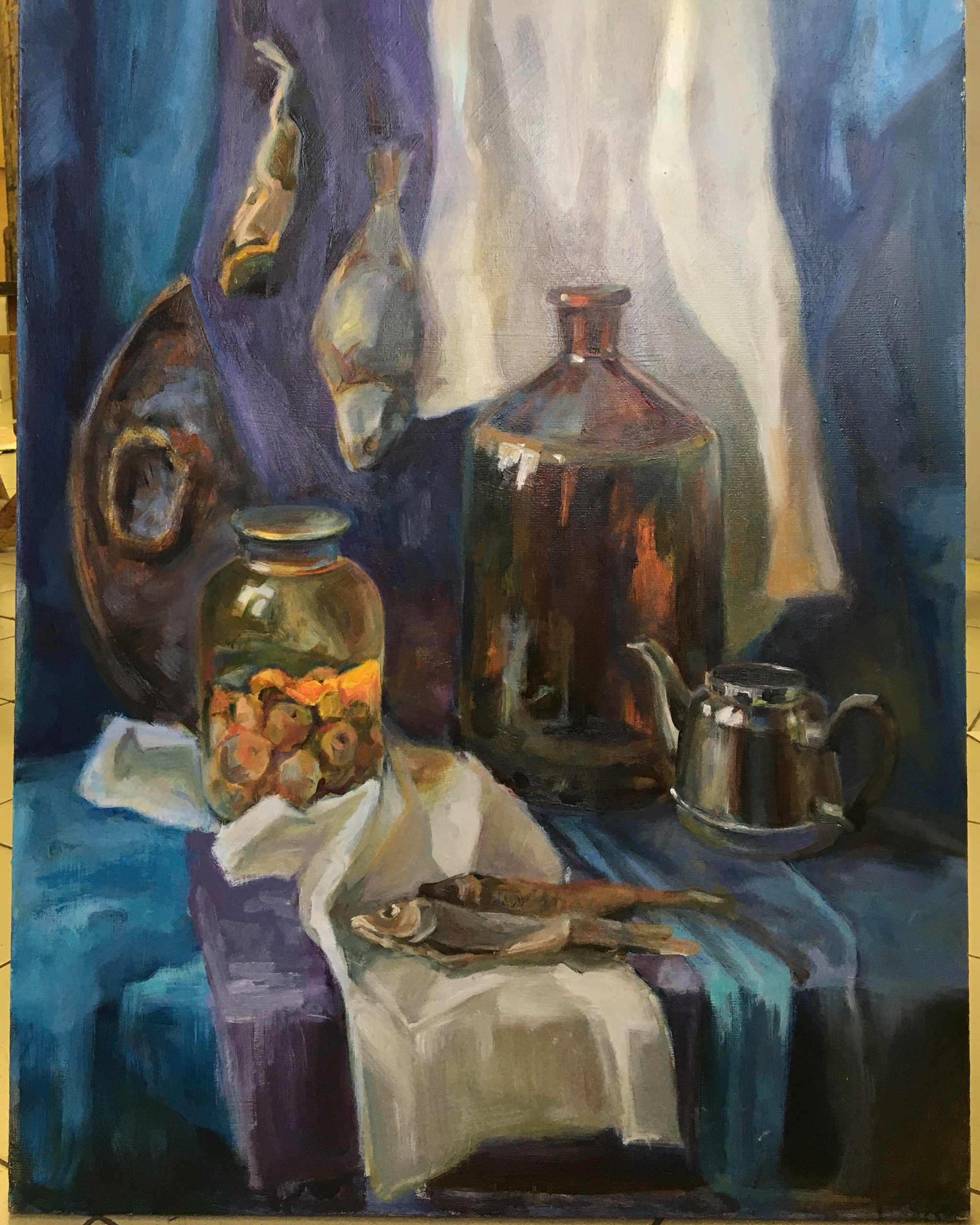Натюрморт с рыбами и компотом) Холст, масло, 50х70 см. Это учебная постановка, предметы из фонда художественного училища. Банке компота лет 15, наверное)
