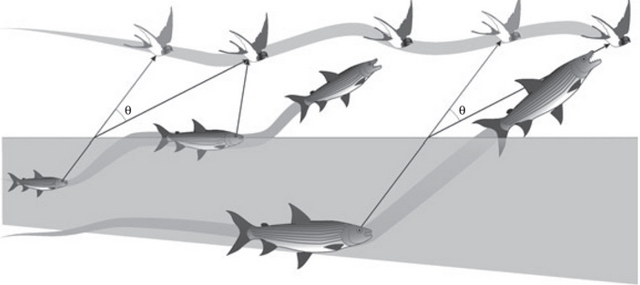 Стратегии ловли ласточек африканской тигровой рыбой. Слева — преследование у поверхности воды. Стратегию, вероятно, использовали те рыбы, которые не могли компенсировать искажение изображения из-за преломления света (угол θ). Справа — прямой прыжок из глубины. Эта стратегия была более успешной для поимки птицы. Р