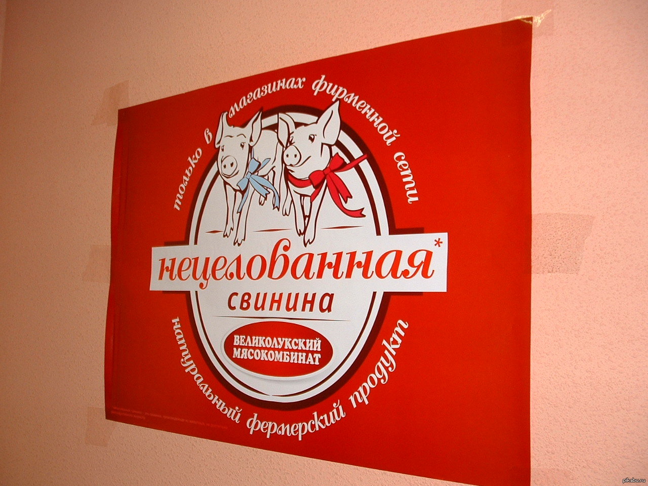 7 Panurge 12 лет назад Рыдал. Сноска в углу плаката:"нецелованная свинина - это свинина, произведённая из животных, не достигших репродуктивного возраста". [моё] Картинки и фото