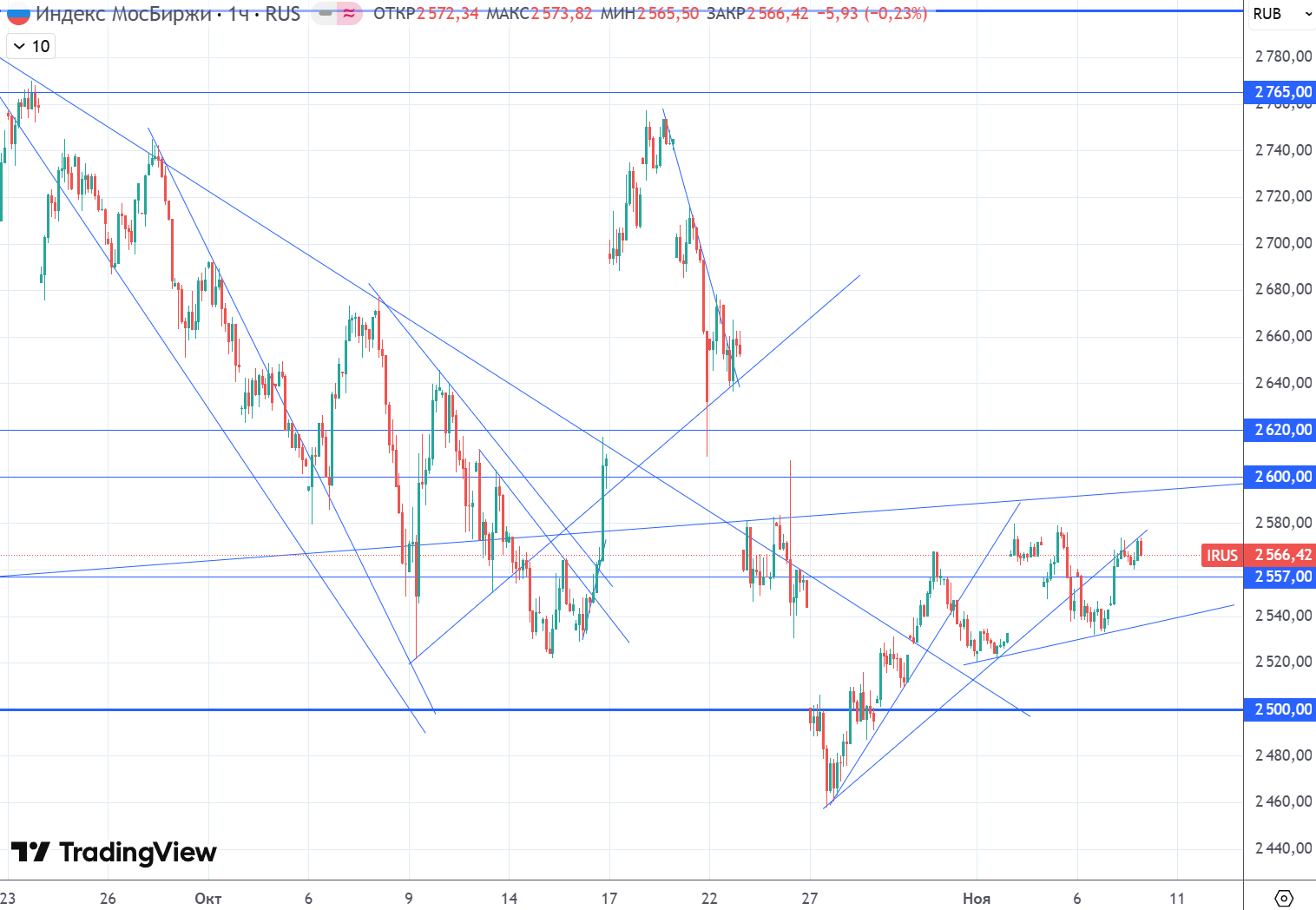 Как и неделю назад, считаю, что шортить бумаги возле 2500 небезопасно, но локально и аккуратно это можно делать в случае пробоя третьего аптренда и закреплении индекса под 2557. Думаю, пока продолжение отскока еще актуальнее увидеть, однако удерживать лонг в случае пробоя локального аптренда не буду из-за выше описанных перспектив. И в начале следующей недели, полагаю, рынок выйдет из боковика и определится с дальнейшим направлением. Обо всех изменениях обязательно предупрежу, как всегда, на своем канале и в чате в реальном времени.