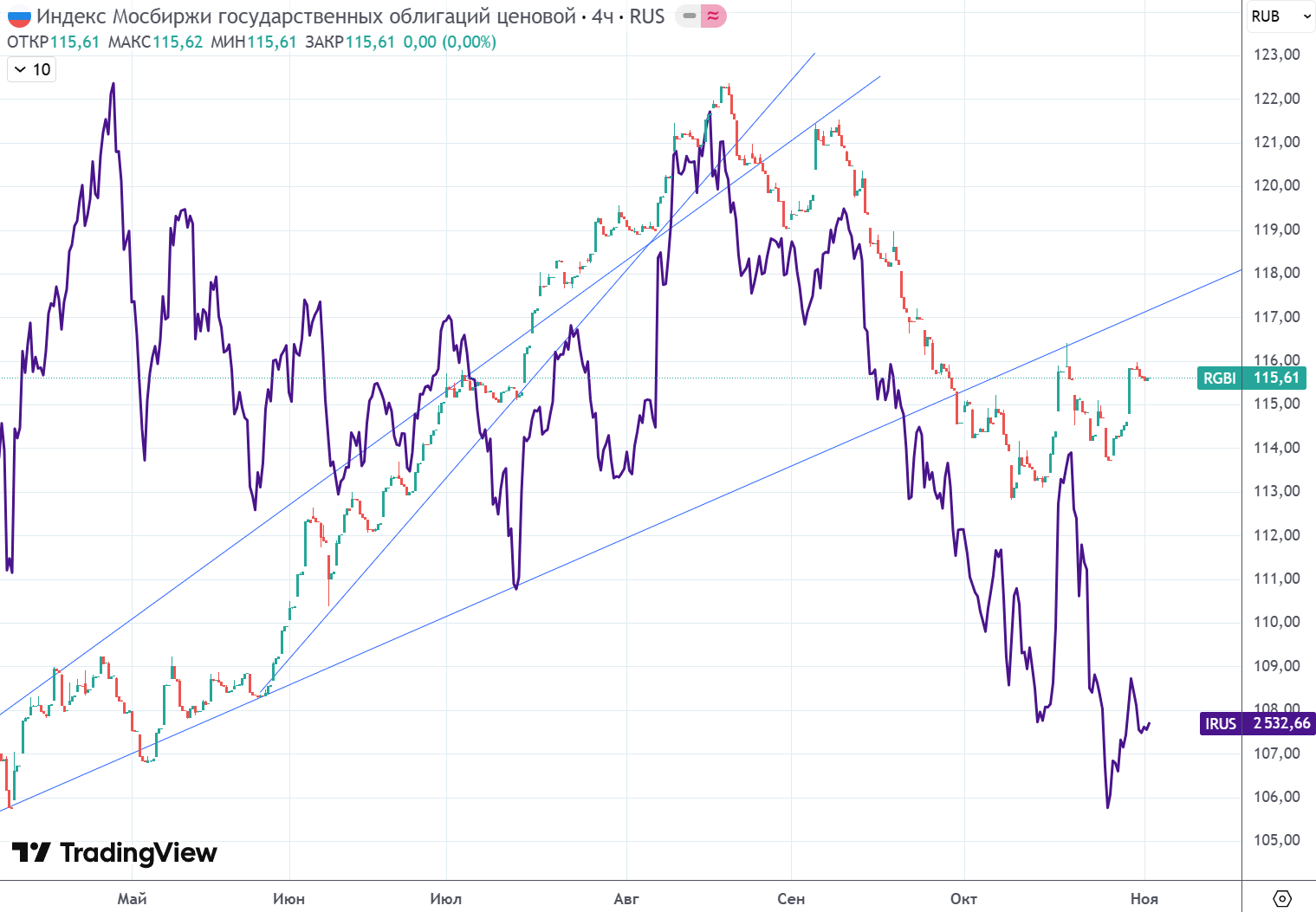 Исходя из технического анализа, можно сказать, что пробой и закрепление индекса под уровнем 2500 в ближайшие недели может привести к ускорению падения рынка акций даже ниже минимумов прошлого года! Не хочу говорить об этом наперед, пока все же надеюсь на отскок бумаг, да и под конец года как-то с трудом верится в какой-то большой обвал, но по графику вырисовывается нехорошая перспектива для акций в случае закрепления цены ниже 2500 в ближайшие недели. В общем, если этот сценарий начнет реализовываться, то тогда, конечно, расскажу о нем подробнее и объясню свою позицию. А пока будем надеяться, что рынок сможет продолжить отскок. График индекса RGBI как раз на это намекает, особенно если удастся пробить 116 вверх. За этим также стоит сейчас внимательно наблюдать.