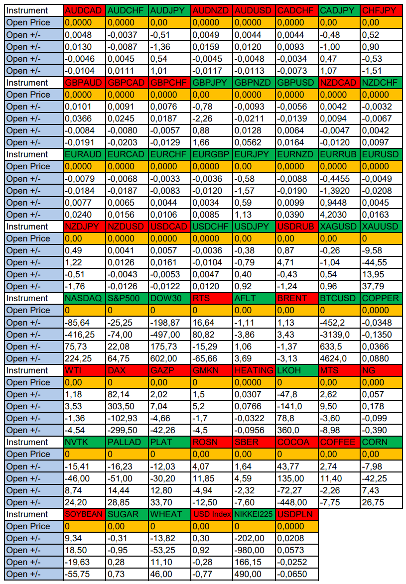 Весь перечень анализируемых активов указан ниже в общем количестве 62 инструмента. Здесь Вы найдете активы рынка Форекс, популярные активы Московской биржи, не менее популярные активы Чикагской биржи СМЕ и мажор криптовалютного сегмента - Биткоин, за которым следуют все альткоины.