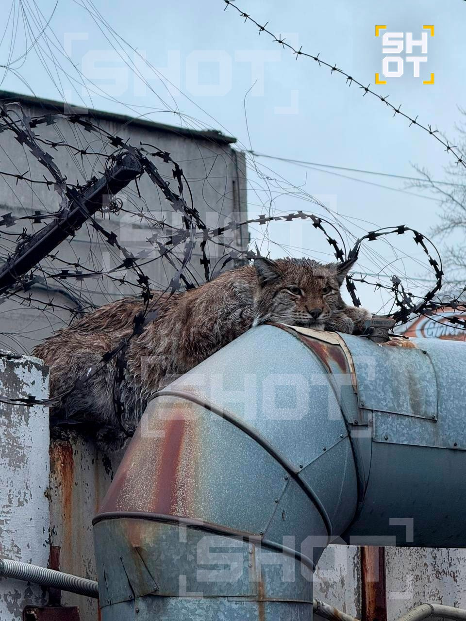 Вероятно, рысь хотела погреться и забралась на трубу теплотрассы.