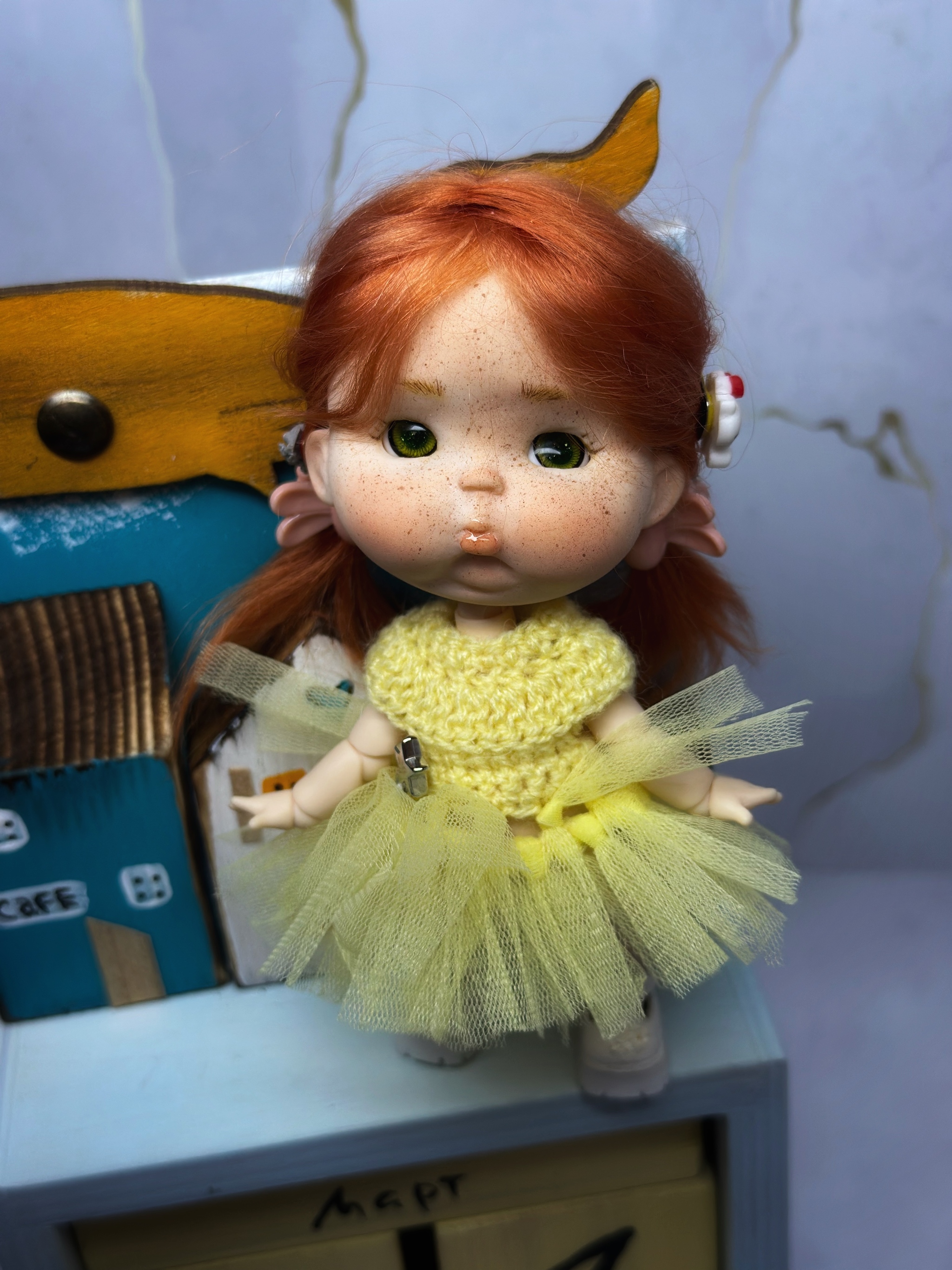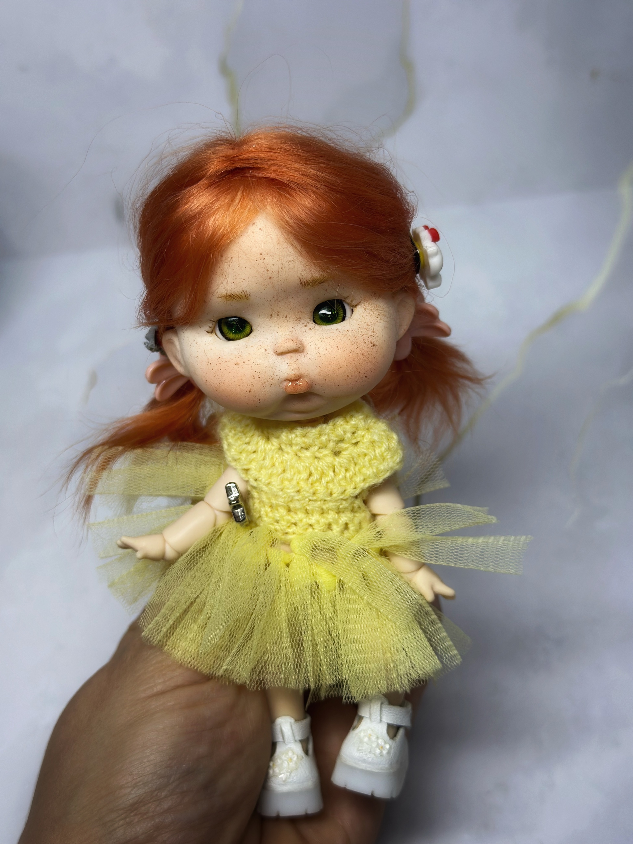 Девочка выполнена на шарнирном теле. Глазки подвижные, паричок снимается.