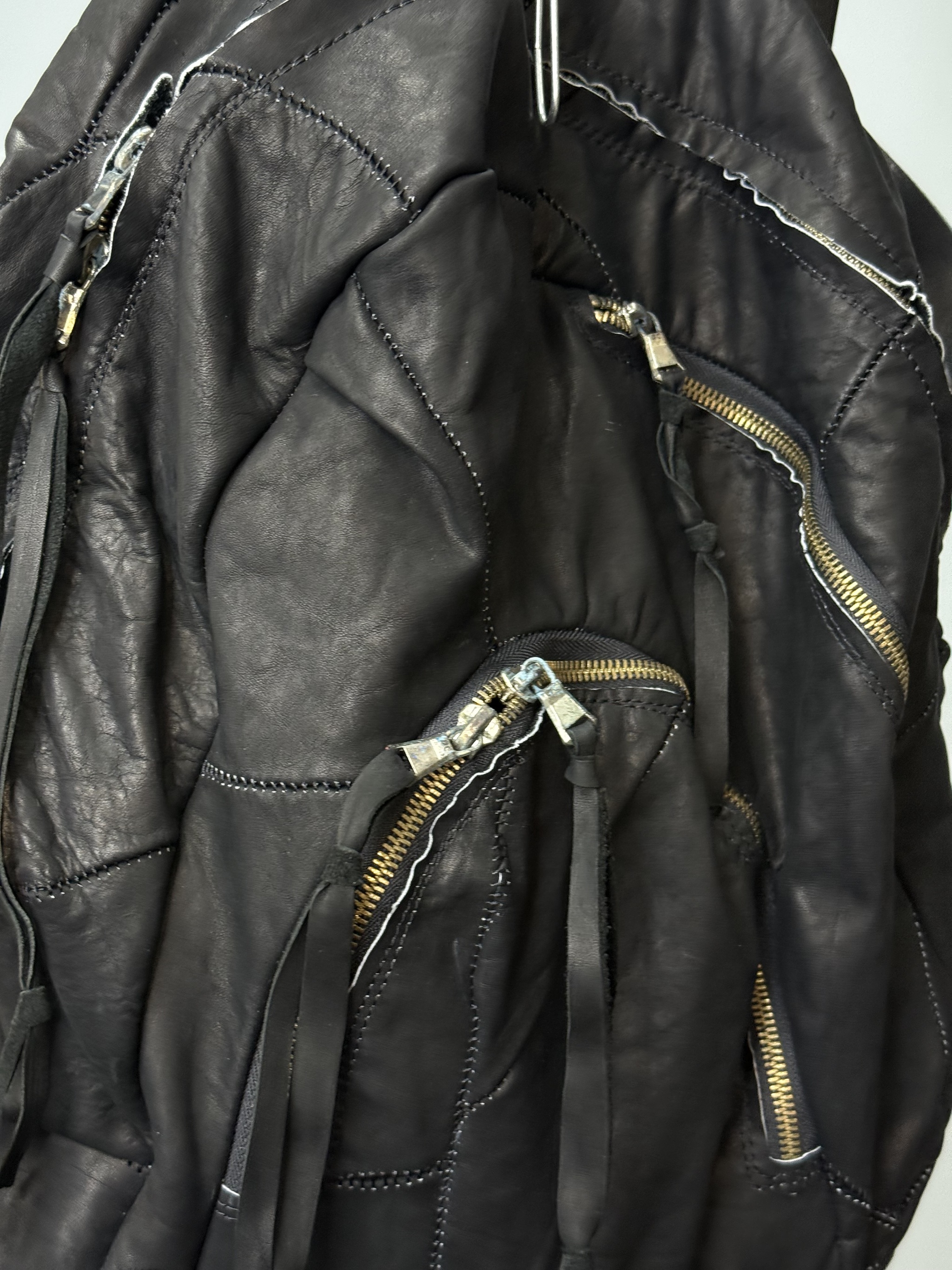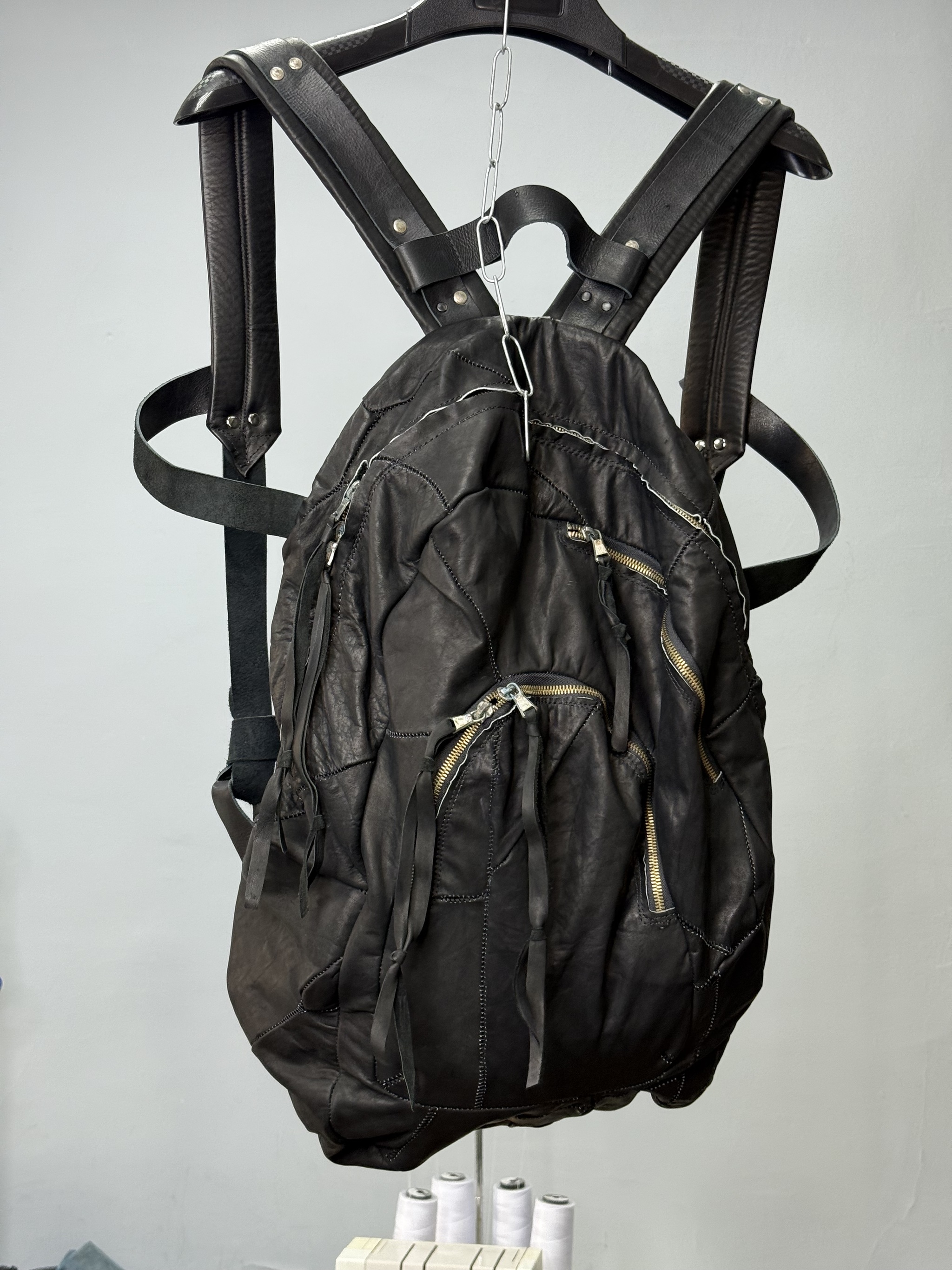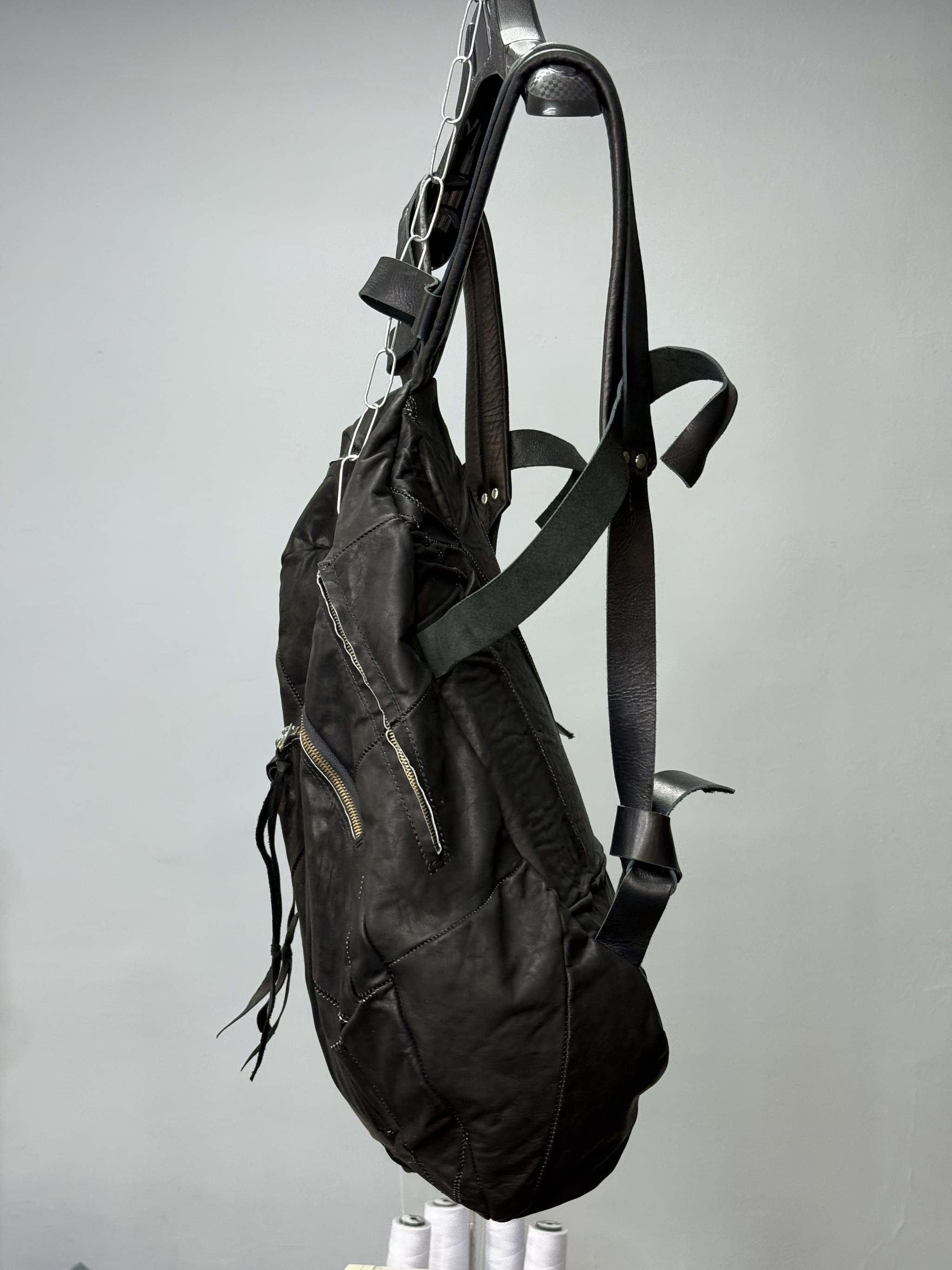 Изначально собрал огромное полотно из обрезков телячьей кожи. После чего раскроил из него рюкзак (причем детали некоторых лекал намерено сделал асемитричным)