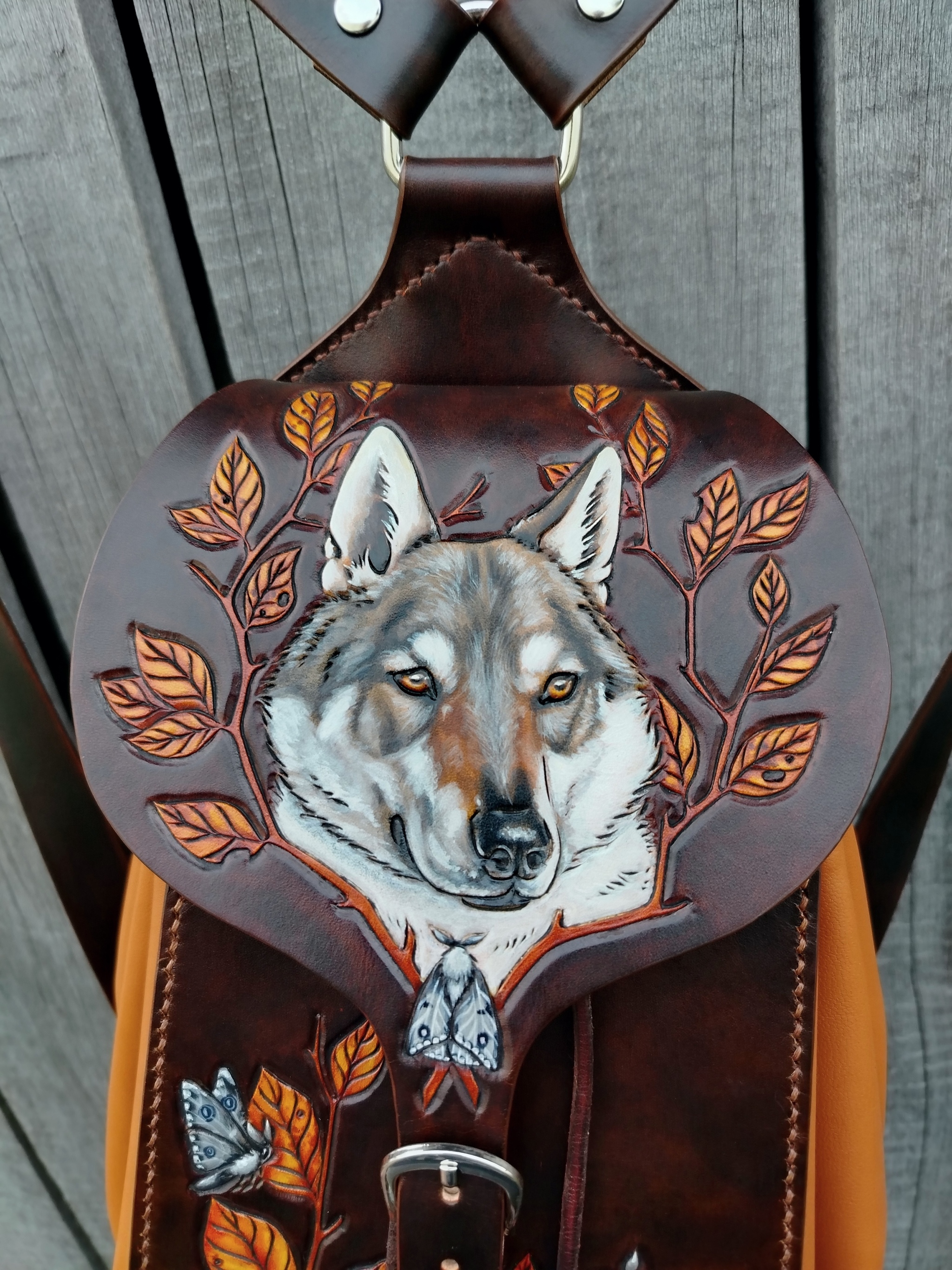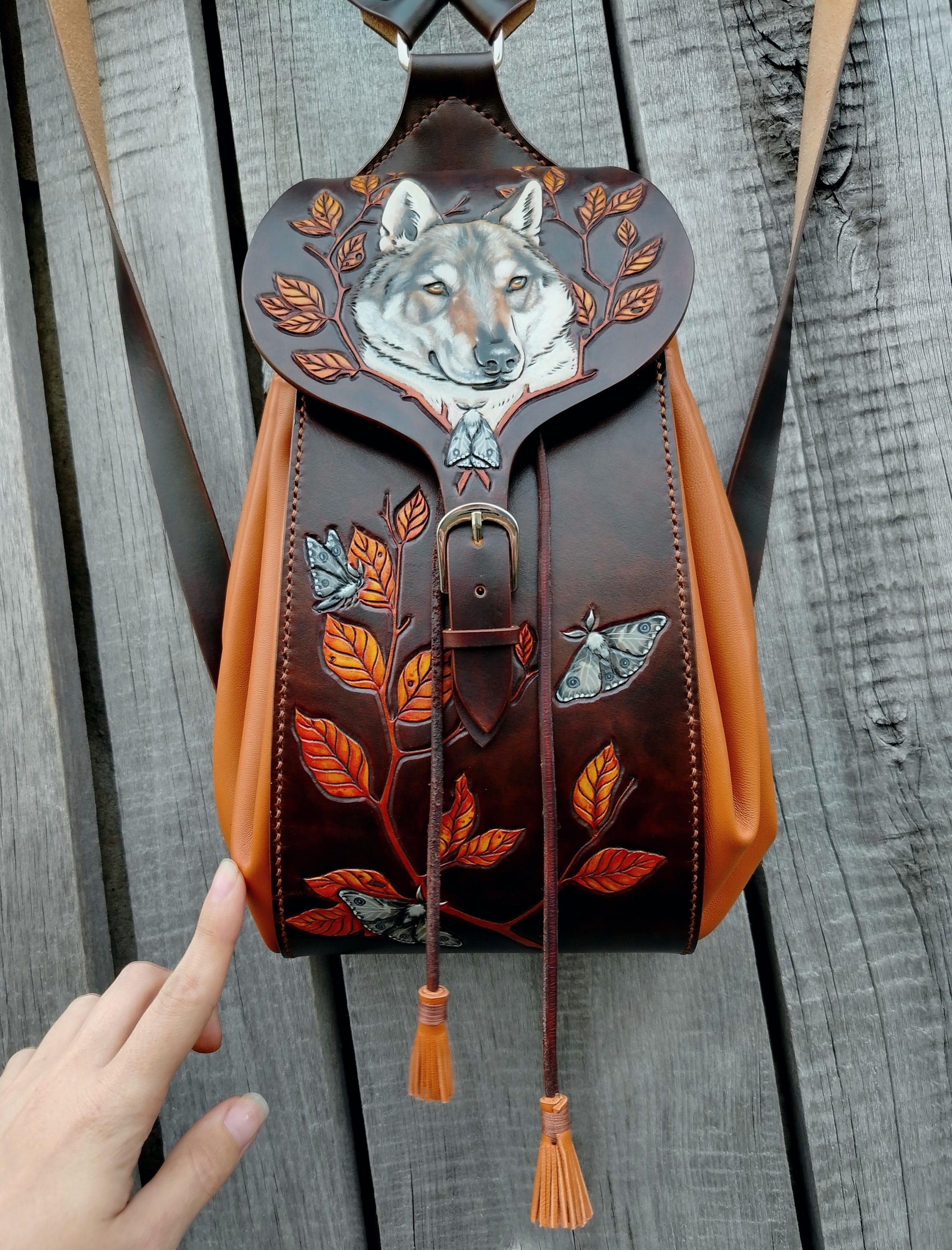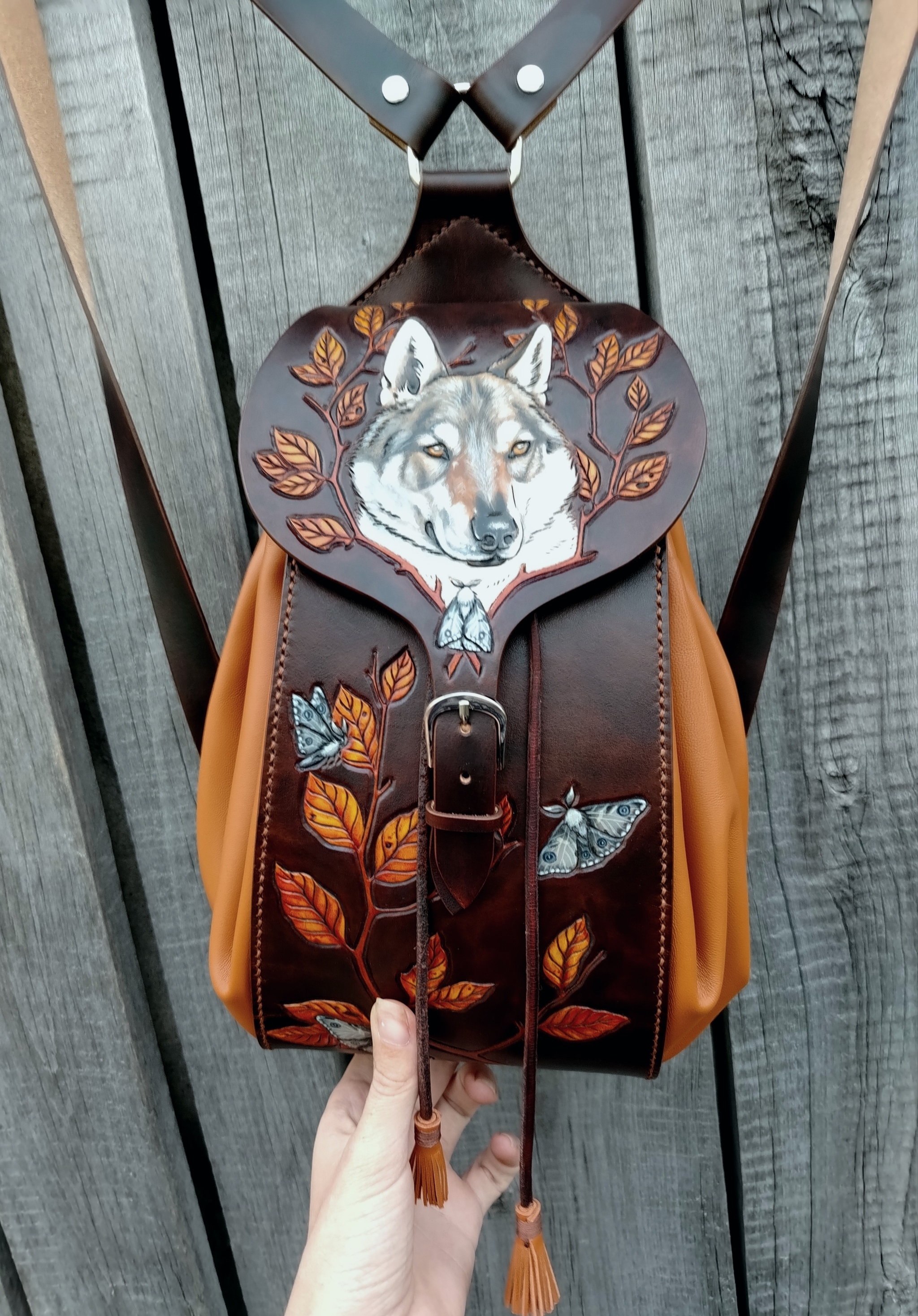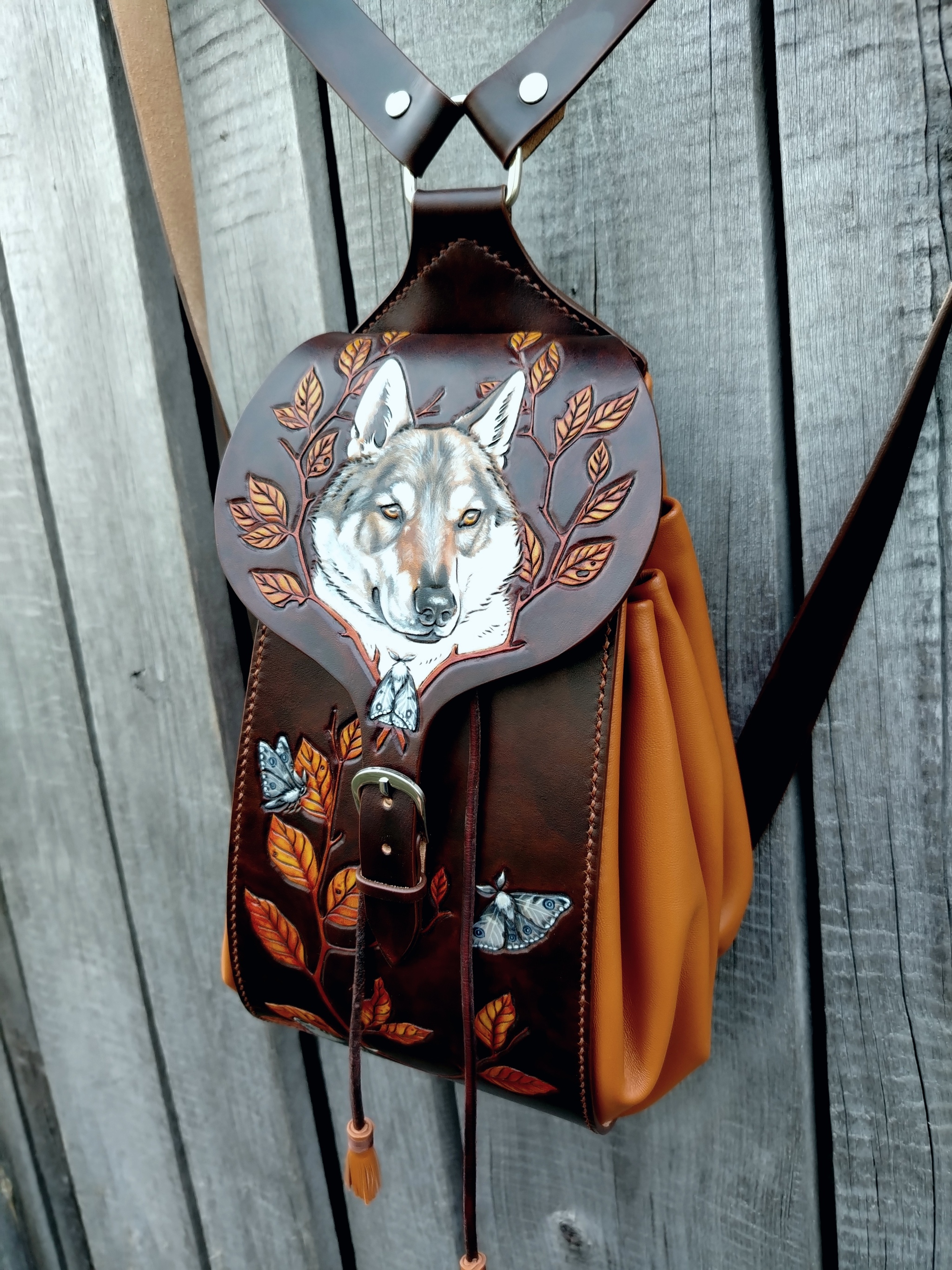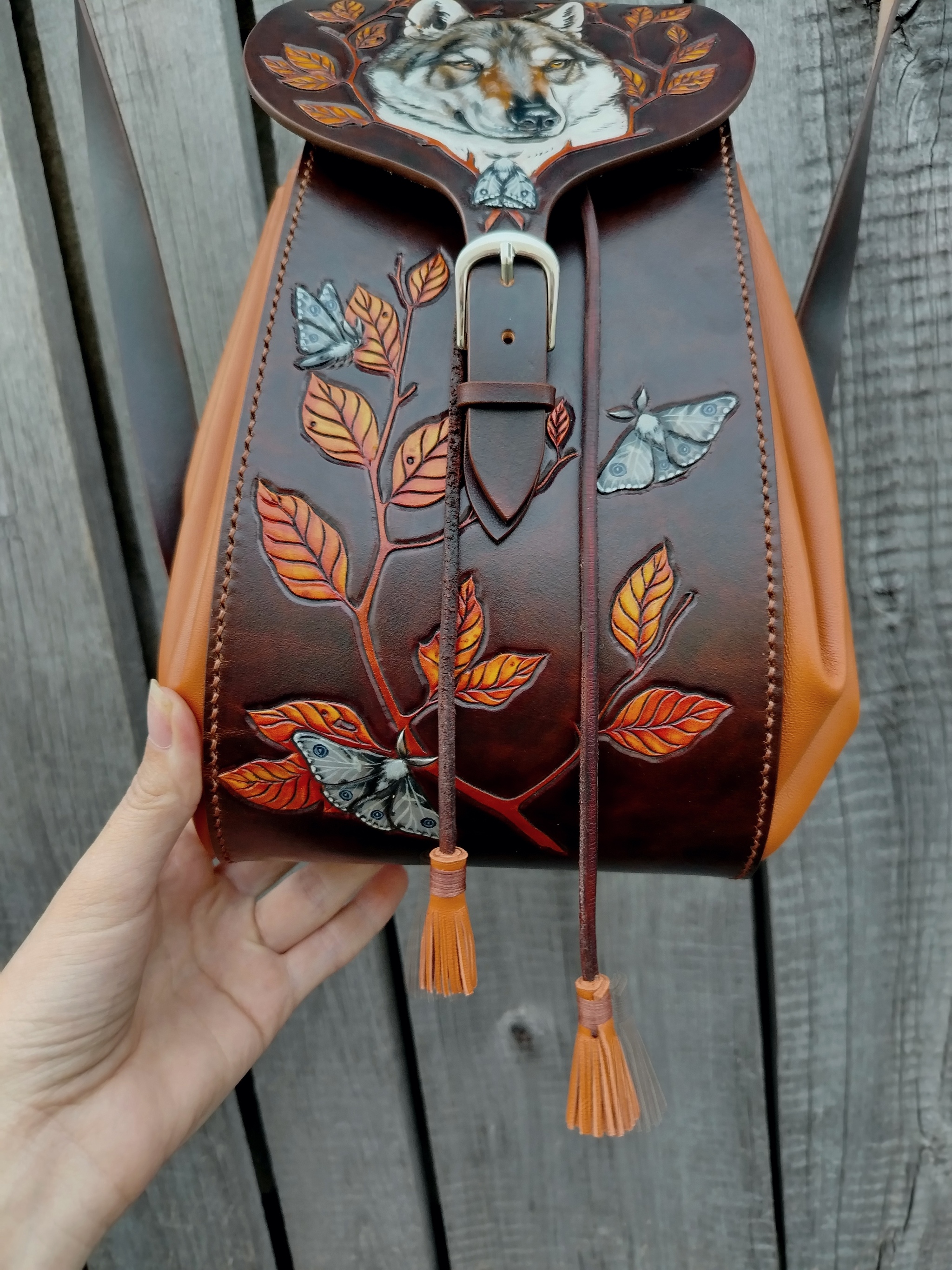 Рюкзак изготовлен из натуральной кожи растительного дубления и мягкой овчины(наппа). Изображения выполнены в технике карвинг(резьба по коже). Роспись проникающими красками +белый акрил. Полностью ручная работа от эскиза до последнего стежка.