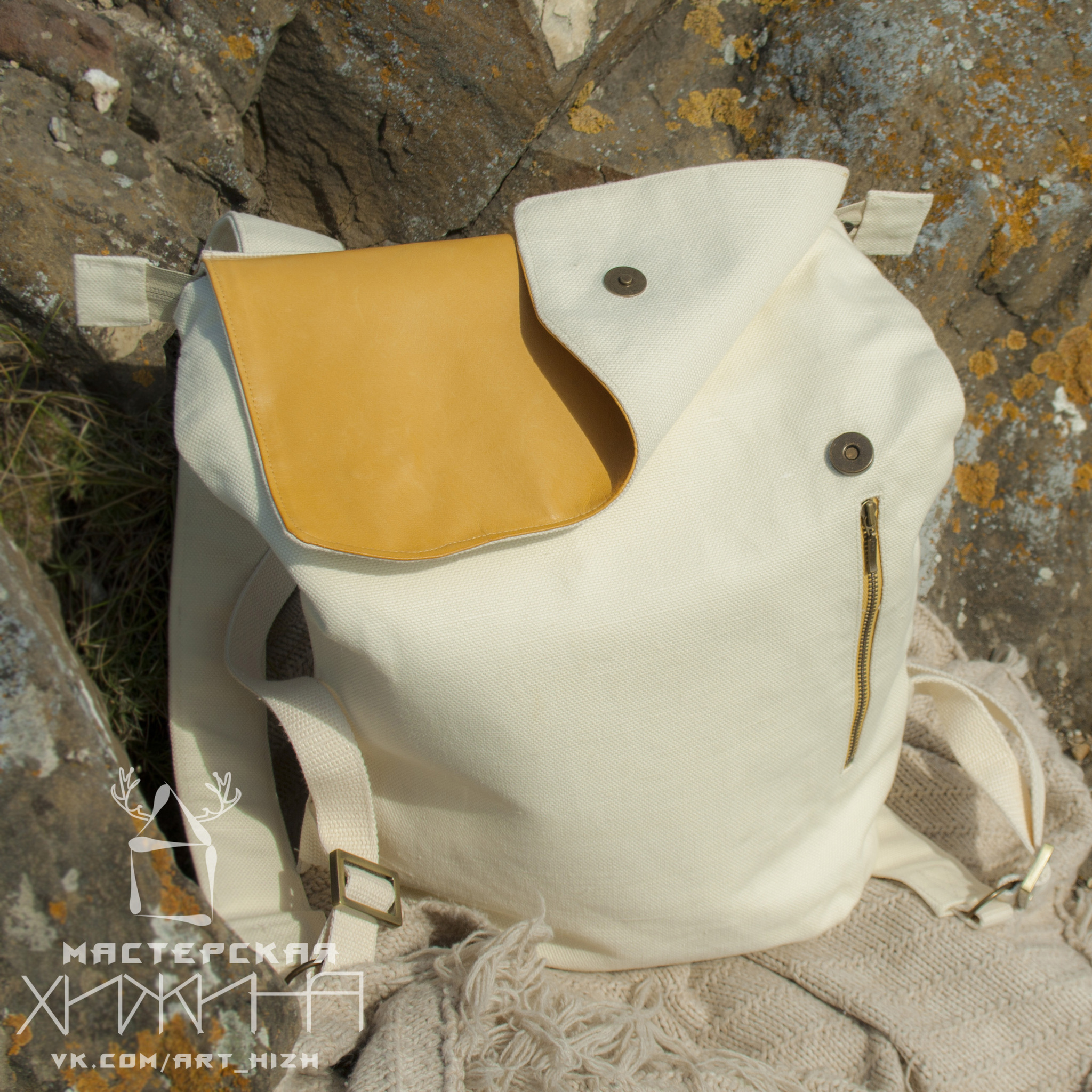 Очень вместительный рюкзак прямоугольной формы. Свежее сочетание цветов - молочный(лён) с горчичным(натуральная кожа).