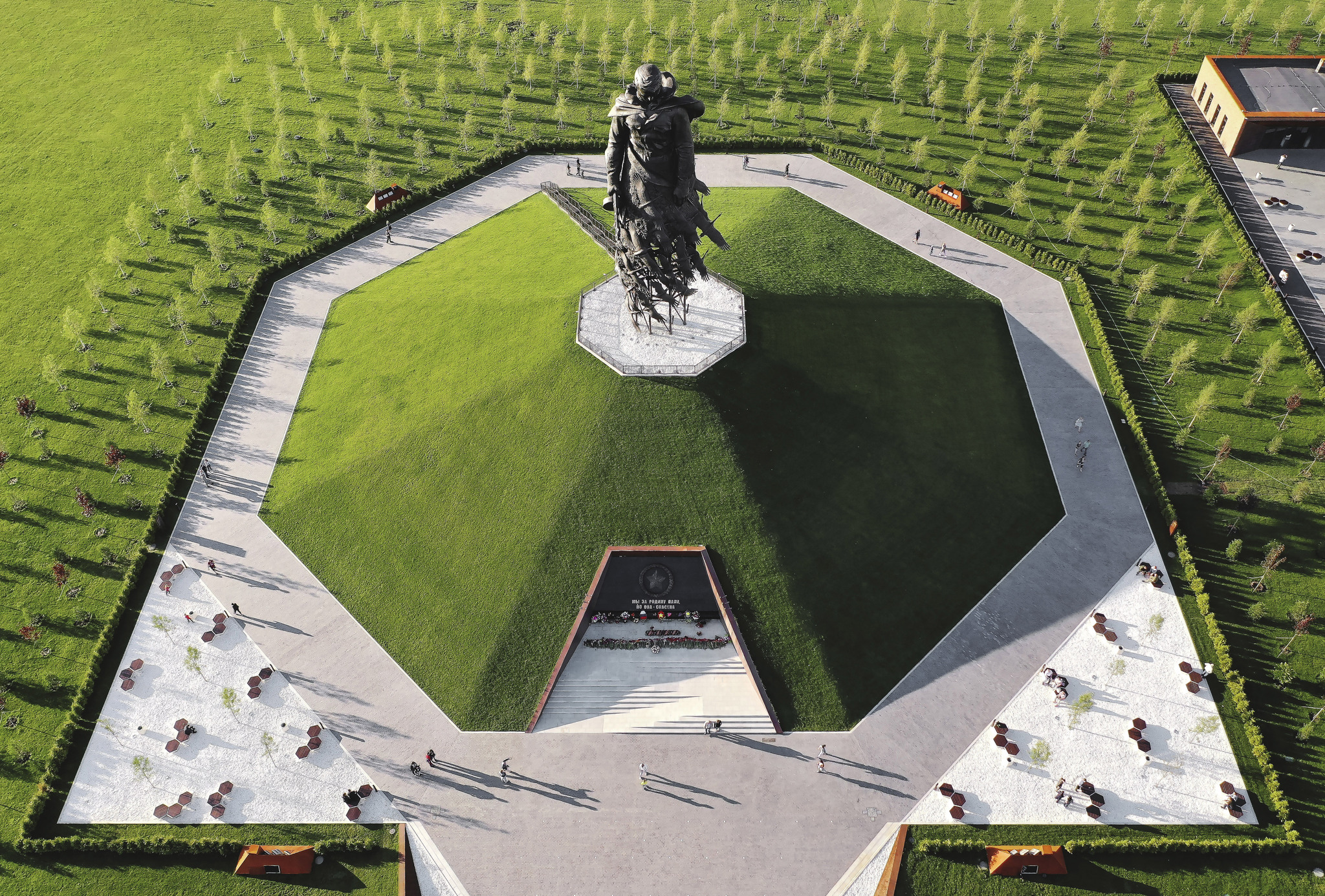 На территории мемориала высажено более 1,5 тысяч кустарников и деревьев, которые со временем гармонично впишутся в художественный стиль комплекса.