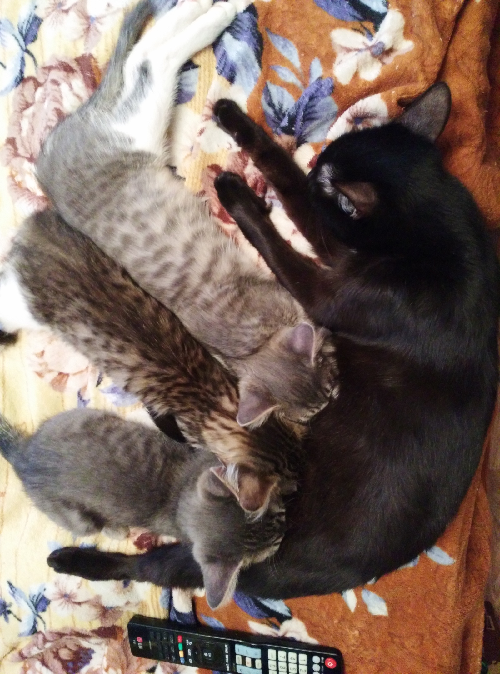 Вот такой выводок у бедной Буси. Папаша привезёный на зиму из колхоза любил свалить через форточку (2 этаж) погулять по окресностям и перед самыми родами видно решил вовсе потеряться. Котятам пара месяцев с хвостиком. Всех достали уже своей дикошаростью. Всё гремит, квартира рушится, шторам и вовсе пиздец. Хорошо что один на днях уедет на ПМЖ к сестре жены вовсе в другой город, а второй в марте-апреле в колхоз мышей ловить и род кошачий продолжать на родине своего папаши.