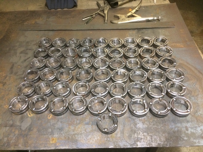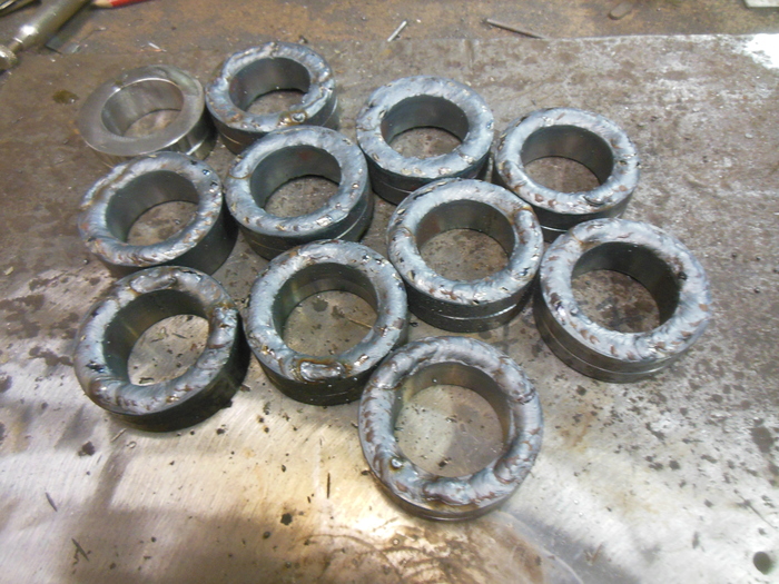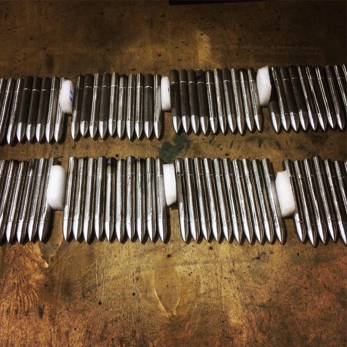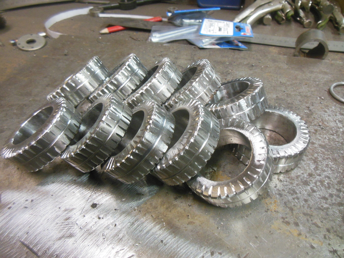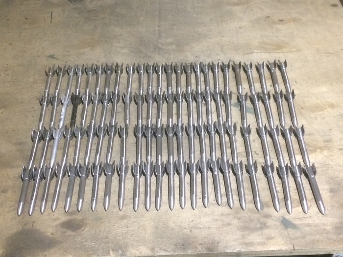 Ну и самих ракет нужно в итоге 144 штуки.Для более менее похожего результата изготовил небольшой кондуктор.количество перышёк получилось 576 штук. Каждое приваривалось и обтачивалось в ручную.
