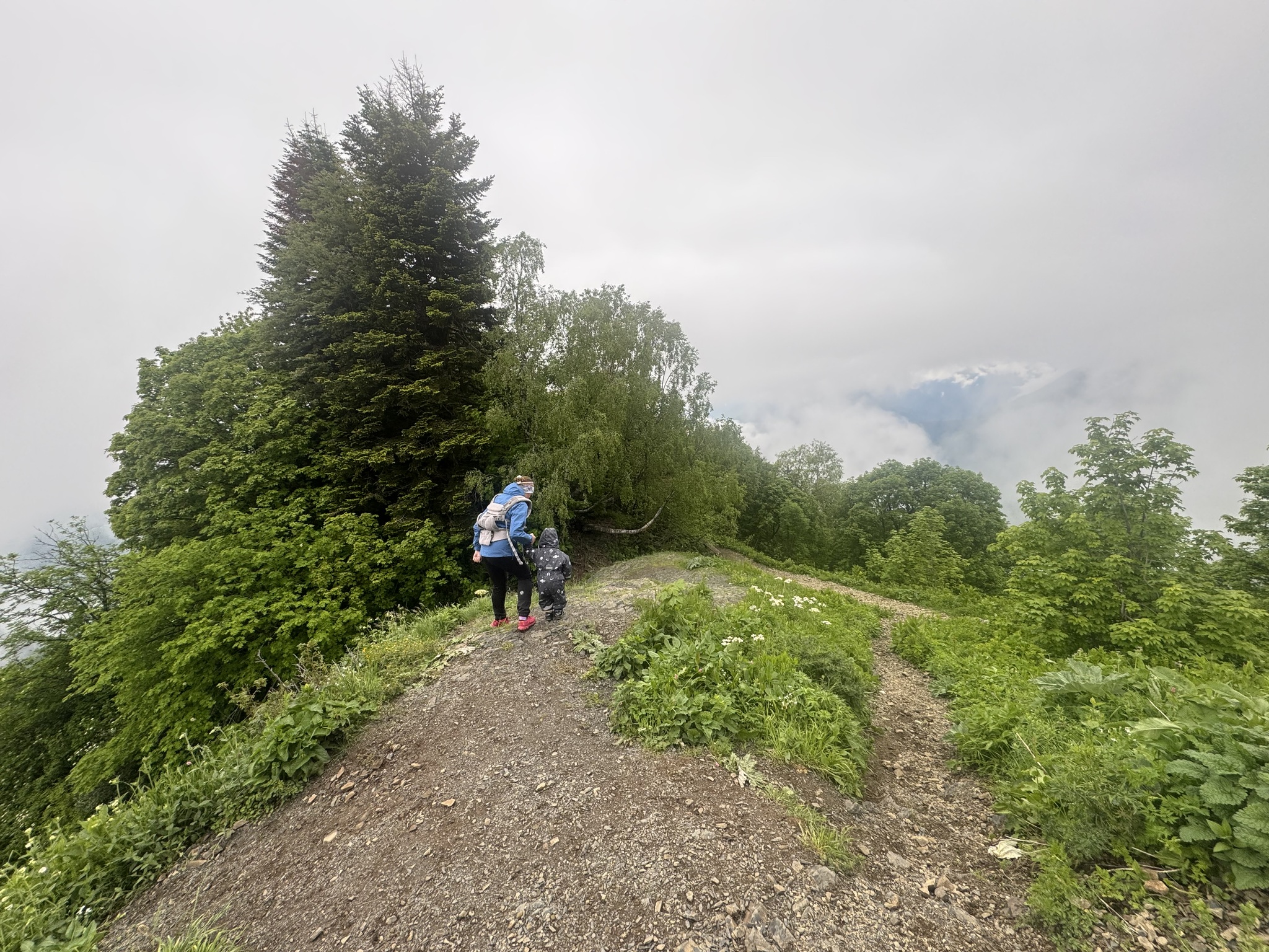 По дороге на Бзерпинский Карниз. Облачно, но справа открывается окошко в облаке на горы. 1/3 пути обратно от смотровой птенец проделал сам за ручку.