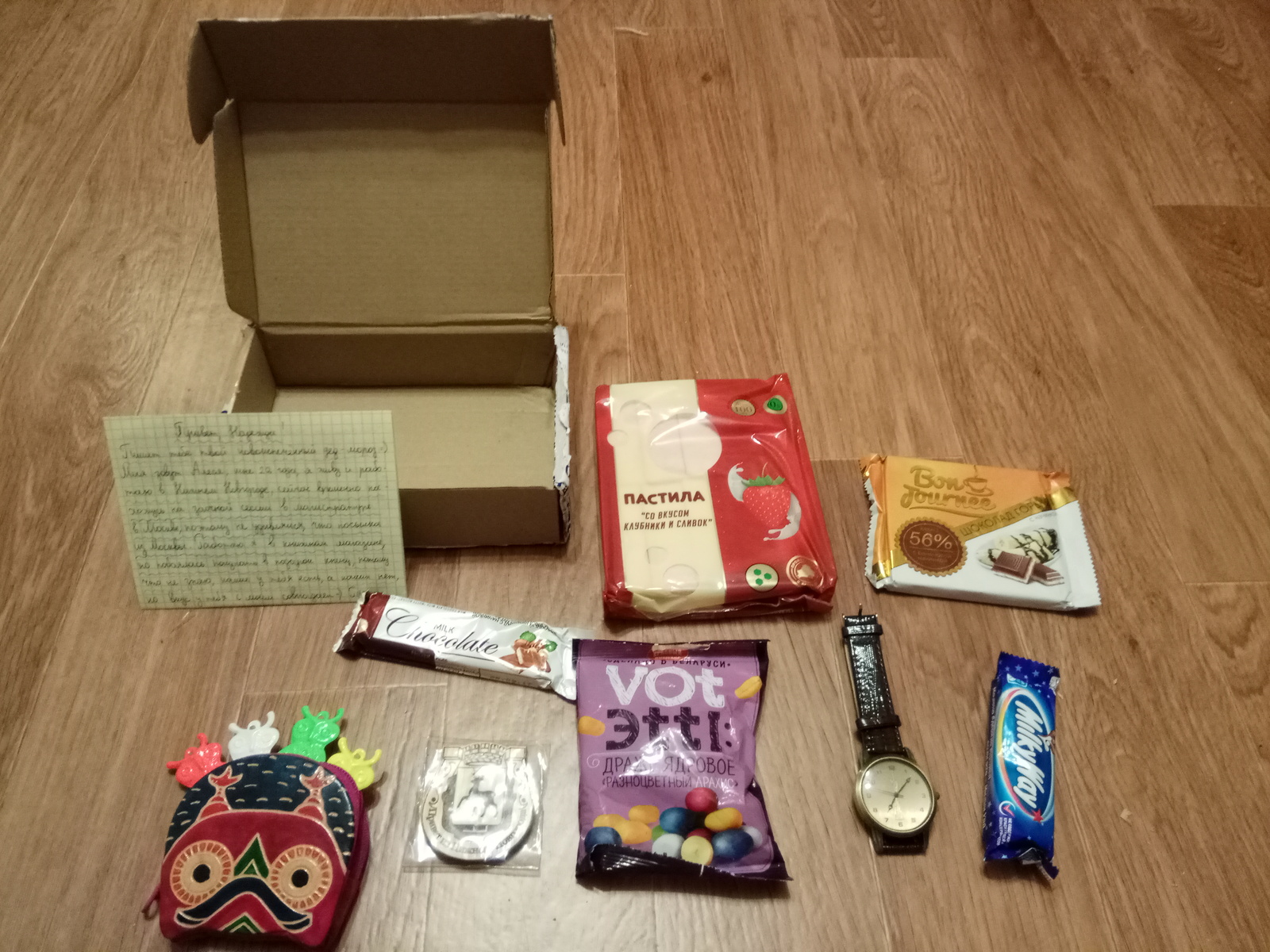Внутри оказалась целая куча радостей: во-первых, кошелечек-совенюшка, внутри которой что-то задорно брякало. Оказалось, что там сидят еще 4 маленьких совы)) Я обожаю сов, поэтому огромное спасибо моей Снегурочке, которая подарила мне столько счастья!!! Во-вторых, чудесные часы, которые, как гласит в письме, являются ручной работой!!! Часы просто супер! Сейчас хожу с ними и всем без зазрения совести хвастаюсь их необычной историей!))) В-третьих, чудесный магнитик с гербом Нижнего Новгорода, который сразу же отправился к нашей коллекции на холодильник))