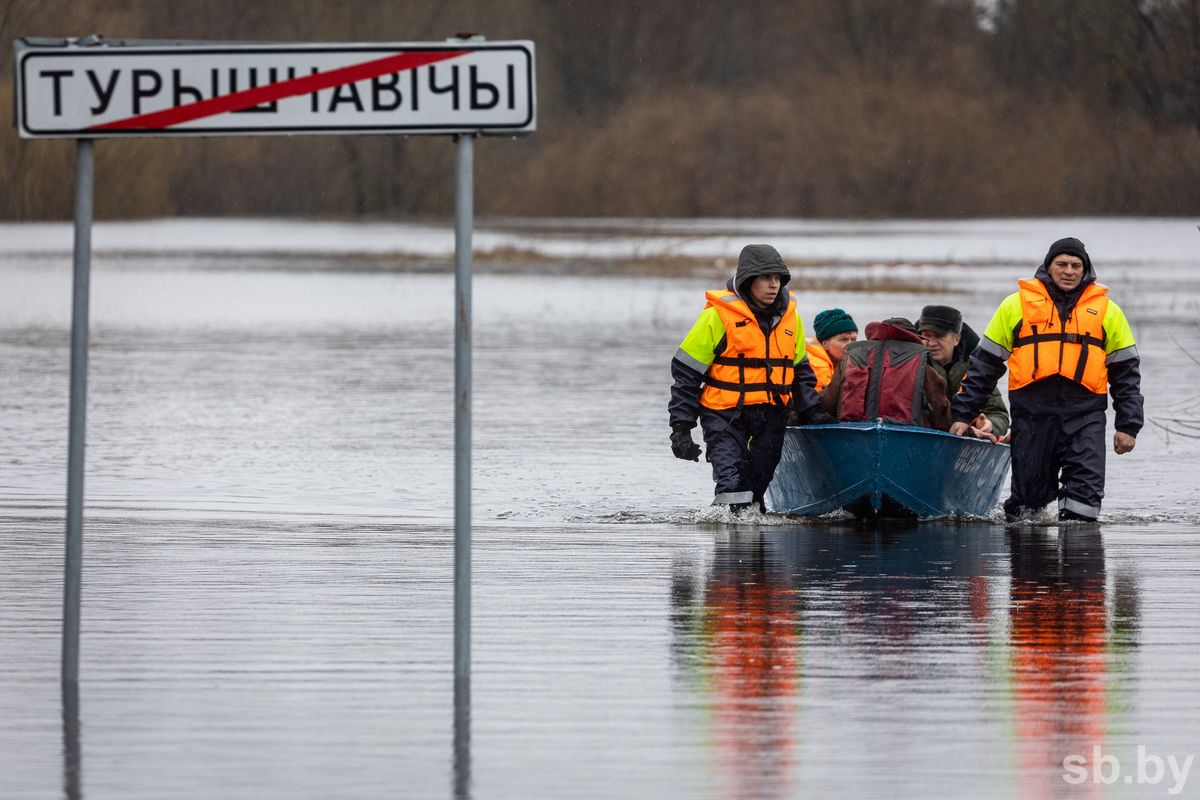 Спасатели Александр Козлов и Вячеслав Кузьменков перевозят жителей деревни в Чечерском районе во время паводка