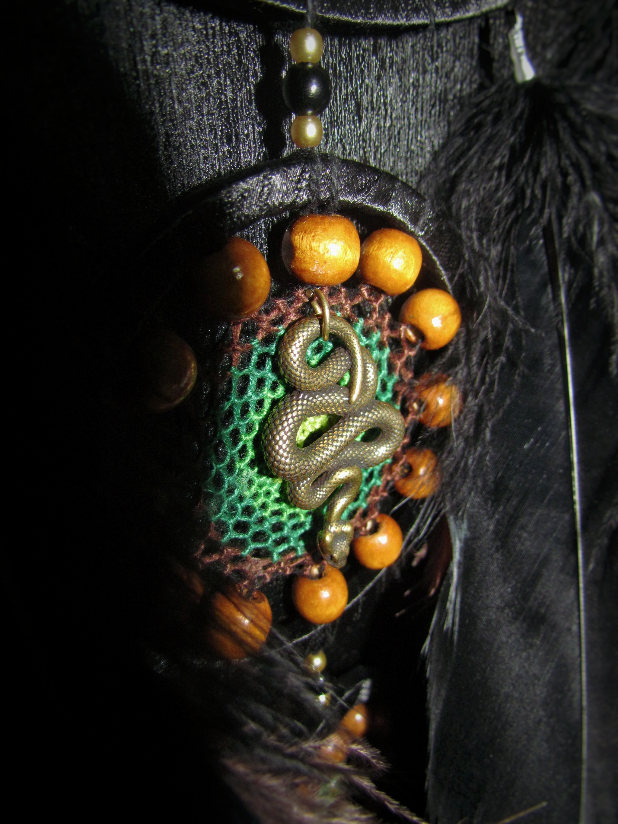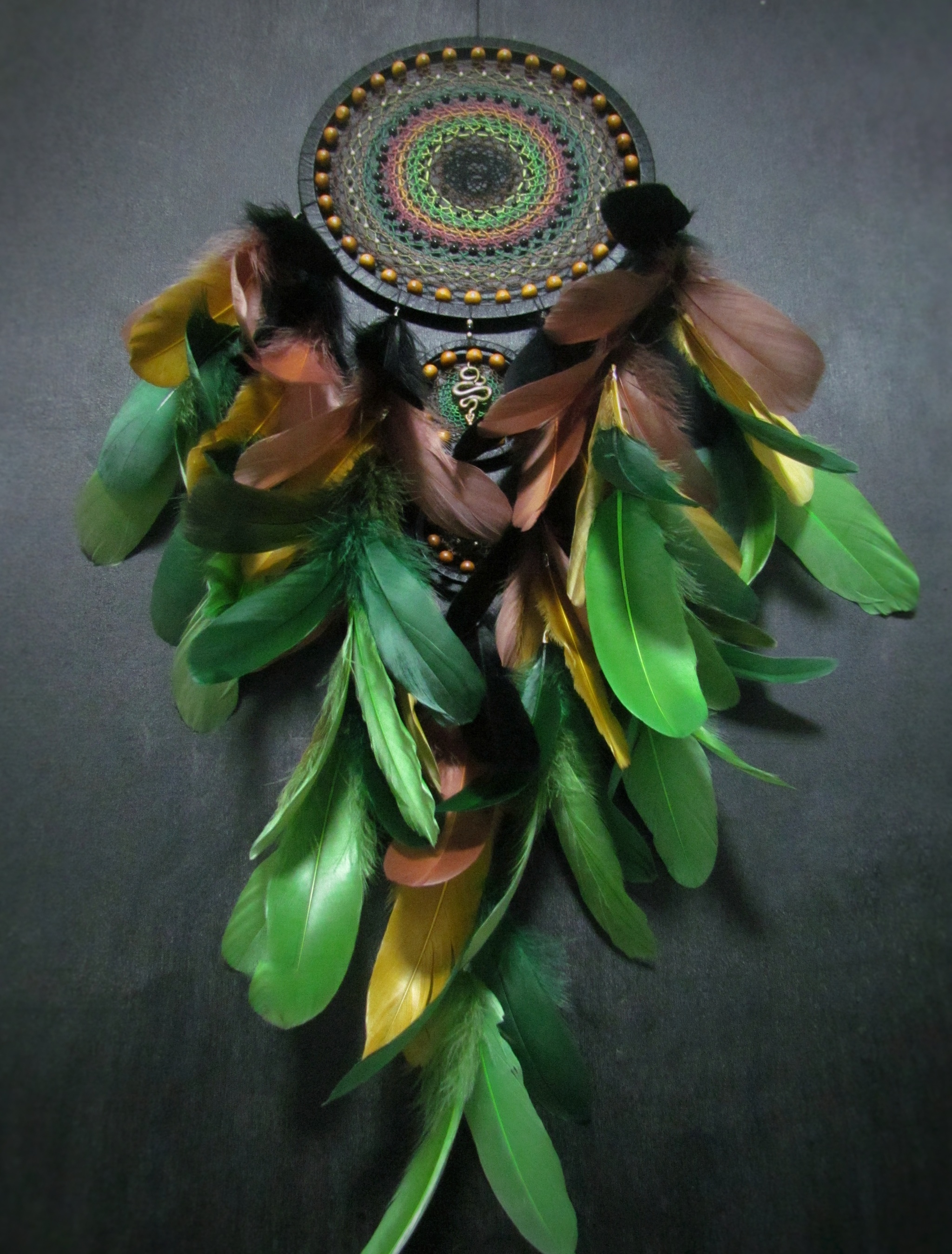 ...покажу вам ловец снов, сделанный в конце прошлого года. Он получился большой и пушистый, с моим фирменным ажурным плетением. А в центре ловца - бронзовая змейка, которая уж точно принесёт владельцу удачу в этом году)
