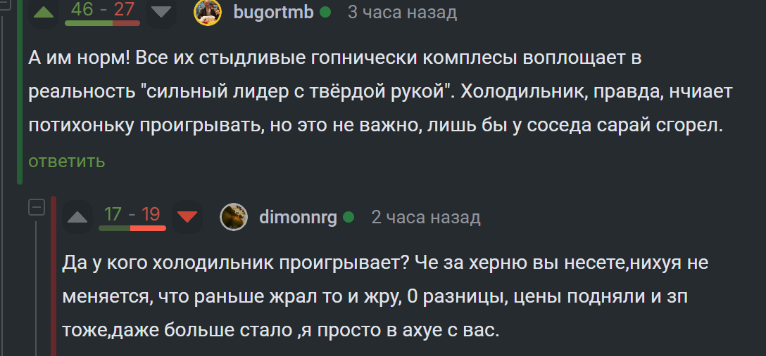 А им норм! Все их стыдливые гопнически комплесы воплощает в реальность "сильный лидер с твёрдой рукой". Холодильник, правда, нчиает потихоньку проигрывать, но это не важно, лишь бы у соседа сарай сгорел.