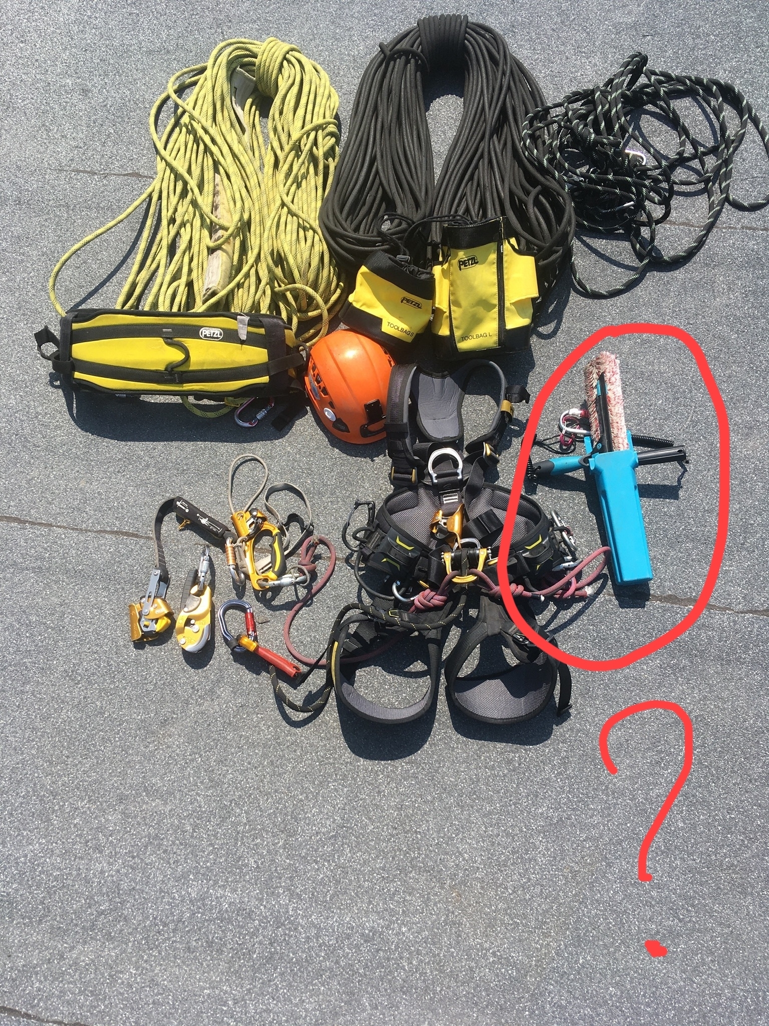 Обвязка, подиум, каска, пара спусковух, пара десятков проушин, страховка, всякие блочки, петли - мелочь которая влазит в баул и в глазах говнарей с таким минимальным набором ты уже будешь выглядеть как ёлка