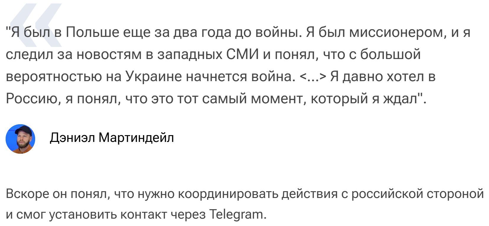 "Мне нужно было понять, где находится линия фронта, где располагаются российские солдаты. Я стал отслеживать это по новостям, смотрел различные Telegram-каналы. Я нашел канал, который относился к подразделению территориальной обороны ДНР, там был бот. Контакты с российской стороной я поддерживал преимущественно через Telegram. Я получал сообщения через этот бот", — рассказал американец.
