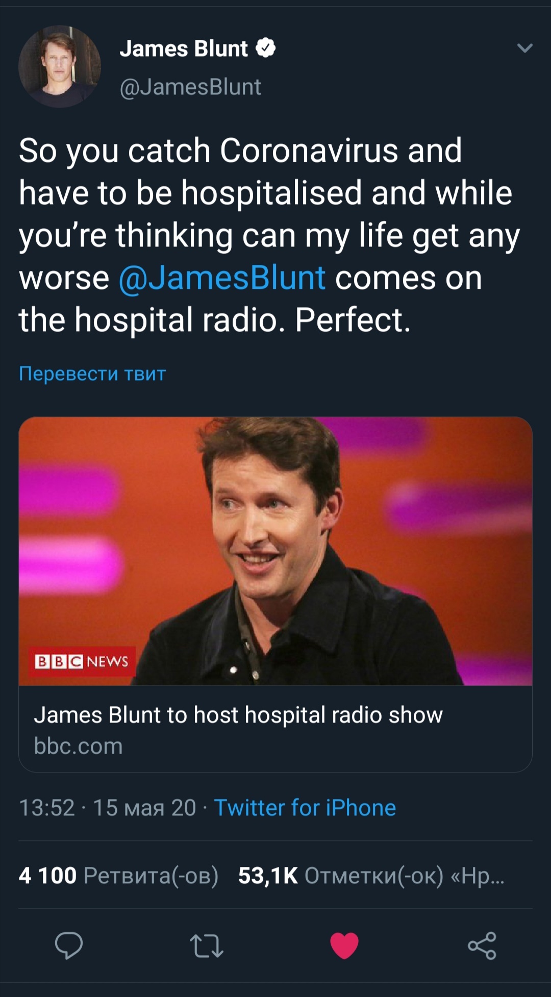 Вы подхватили коронавирус, и вам пришлось госпитализироваться. И пока вы думаете: "может ли моя жизнь стать ещё хуже" Джеймс Блант приходит на радио. Идеально.