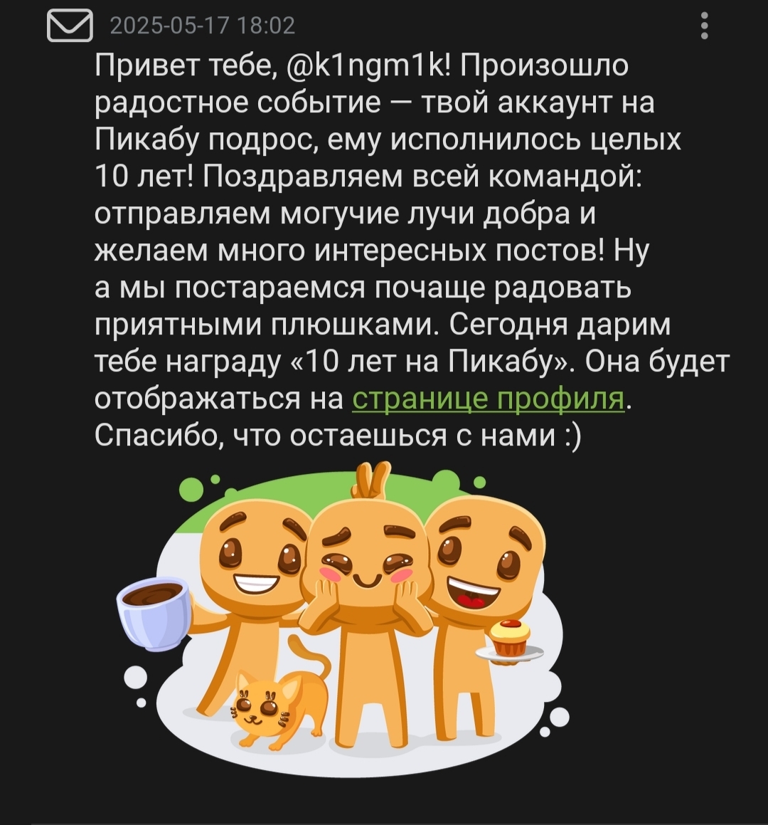 Уж и не верится, что прошло целых десять лет (а может и больше, не помню точно, сколько читал ресурс неавторизованным) на Пикабу. За это время портал стал для меня настоящим домом, местом, где можно до утра читать чужие срачи в комментариях, окунуться с головой в материал и просто хорошо провести время. За эти годы я видел, как платформа росла, развивалась и менялась. Появлялись новые тренды и мемы, как кого-то топили в минусах, а кто-то сам уходил, но потом возвращался, как кого-то разоблачали в лучших традициях детективных сериалов на НТВ. Каждый день приносил что-то новое: интересные истории, полезные советы, смешные картинки и видео. Пикабу стал не просто сайтом, а частью моей жизни. Спасибо всем пользователям, модераторам и разработчикам за эти прекрасные десять лет, за то, что сделали ресурс таким, каким он есть. Впереди, я уверен, нас ждет еще больше интересного и нового. Пусть Пикабу продолжает радовать нас своими постами и комментариями, а мы будем продолжать делиться своими историями и впечатлениями.