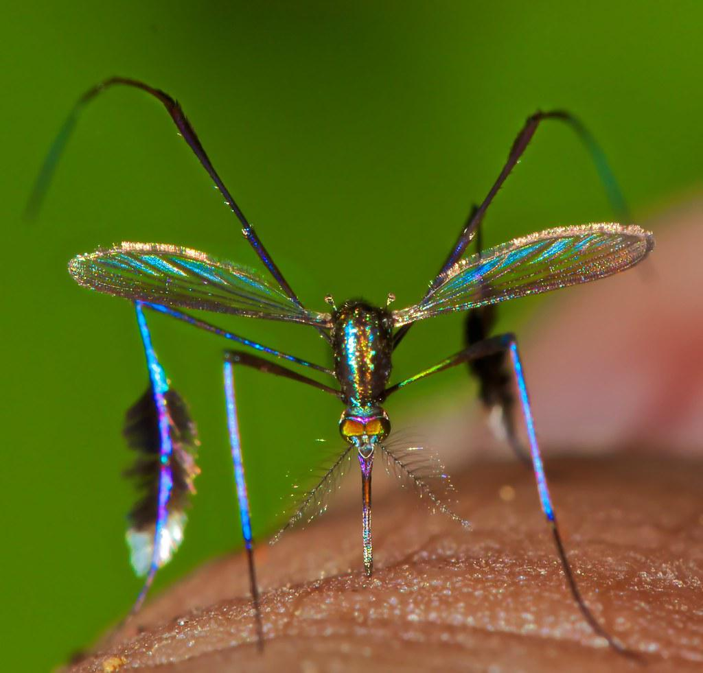 Но всё равно, несмотря на научное объяснение странных повадок комара, я готов подставить ему руку помощи и напоить несколькими каплями своей крови. Чисто, чтобы полюбоваться уникальным металлическим комариком. Который, кстати, не переносит опасных для людей заболеваний, в отличие от десятков видов другого тропического гнуса!