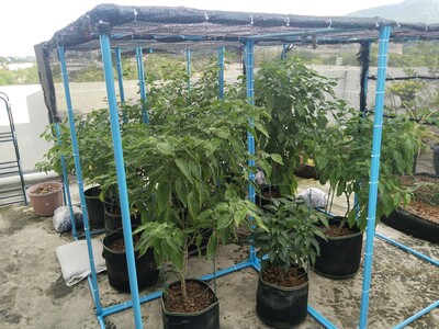 На фото небольшой кусочек нашей крыши. В наличии сейчас два вишнёвых дерева, одно лимонное, одно гранатовое, два десятка перцев из топа самых острых (Carolina Reaper, Dragon's Breath, Trinidad Moruga Scorpion, Death Spiral, Ghost Pepper и другие), дыни "Торпеда" (вон они как раз на фотке; семена родители прислали из России), ананасы и куча всякой разнокалиберной мелочи типа кактусов, цветов и водяного шпината.