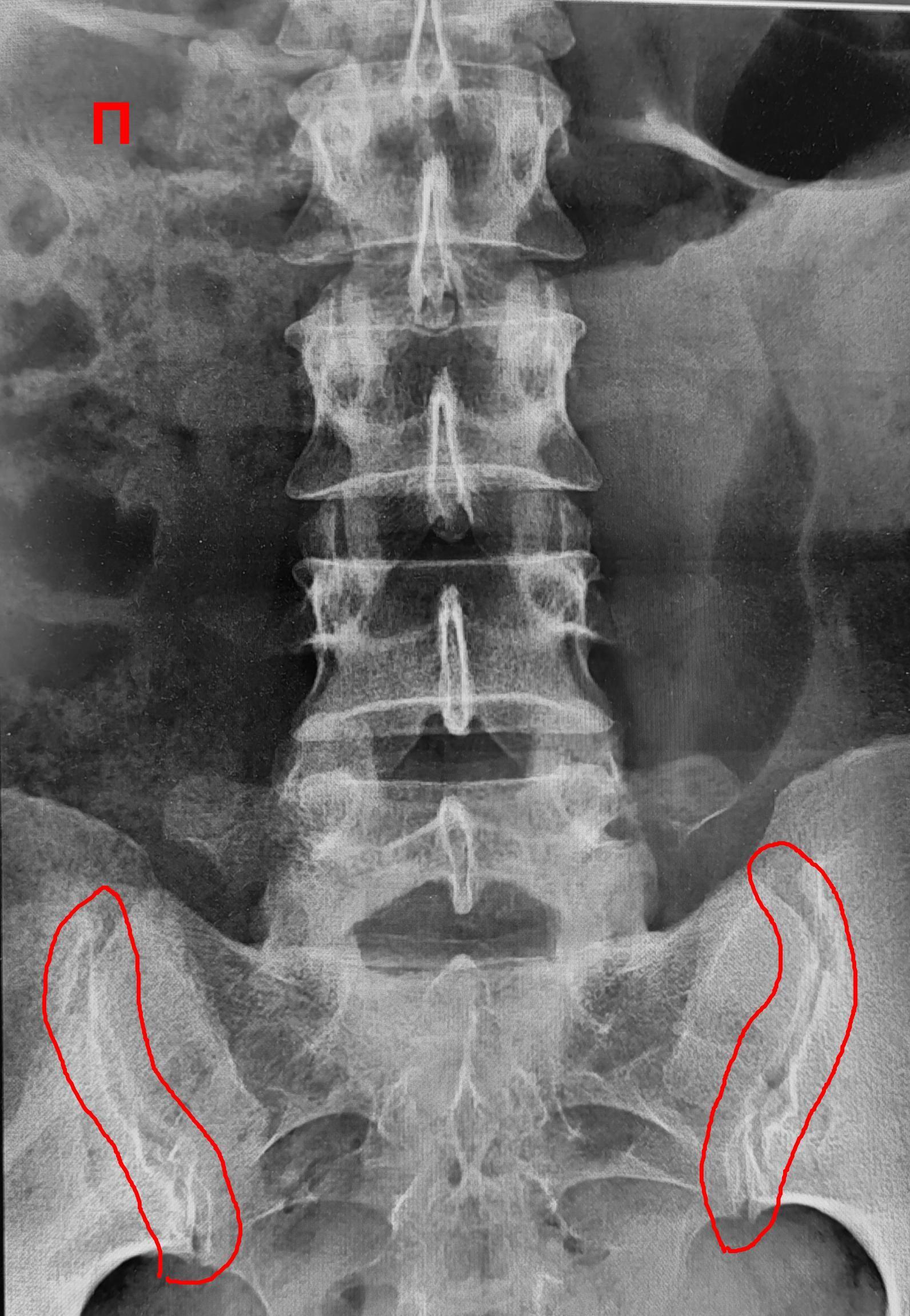 Обращают на себя внимание крестцово-подвздошные сочленения(КПС),отмечается неравномерное не выраженное сужение щелей КПС с локальными участками расширения, субхондральный склероз- более выраженный слева, имеются двусторонние краевые остеофиты, в нижней трети левого КПС суставная щель не ровная, "изъеденная", по причине наличия единичных эрозий костной ткани. Заключение: Двусторонний сакроилиит 2 ст.(более выраженный слева).