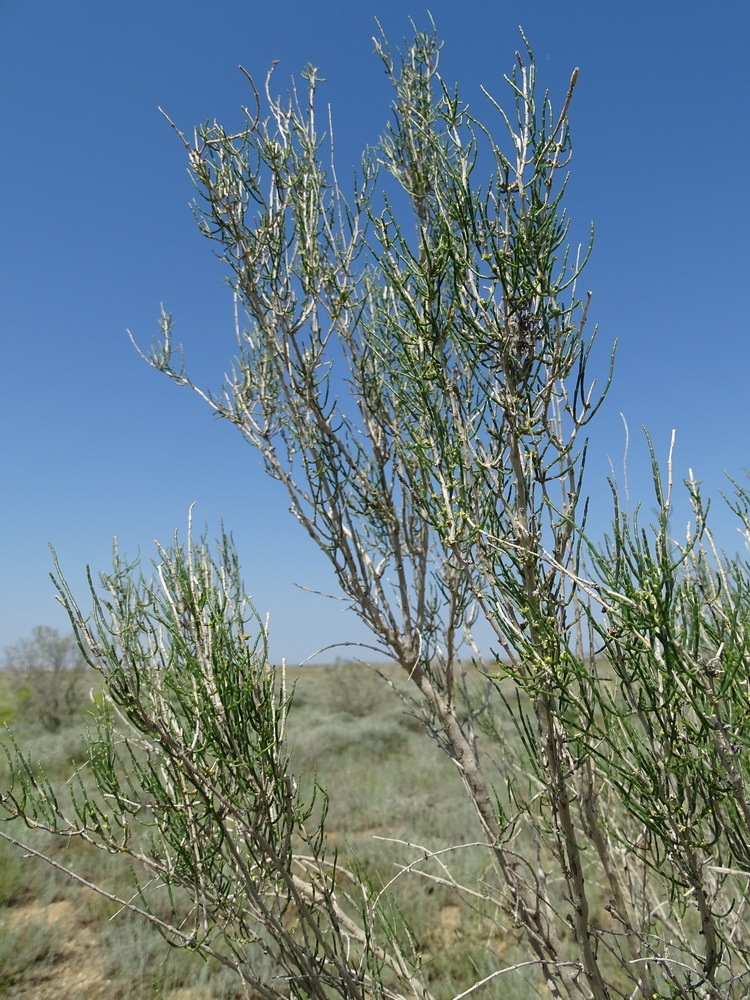 Саксаул зайсанский – это многолетний кустарник или дерево высотой до 2-5 метров, с серой корой и искривленными ветвями. Листья чешуевидные, редуцированные, и процесс фотосинтеза осуществляется зелеными, мясистыми побегами.