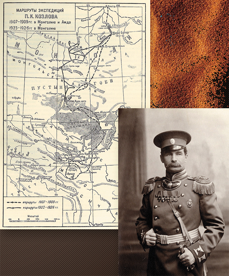 Карта маршрутов экспедиций П.К. Козлова и его портрет. Фото с сайта elementy.ru.