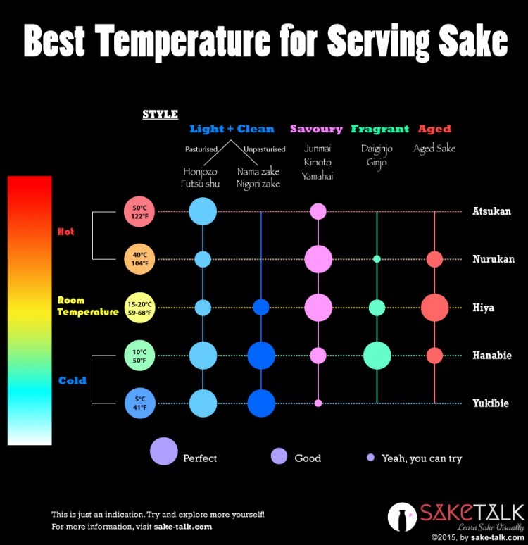 Ну а вообще, для большей части сортов сакэ оптимальная температура подачи лежит в диапазоне от 5 до 20 градусов Цельсия. Нашла прекрасную табличку с рекомендуемой температурой подачи в зависимости от типа сакэ.