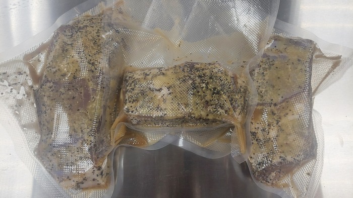 Натираем всё это на сало и вакуумируем. Можно конечно и просто убрать в пакетик, но вакуум надежнее и сок от чеснока лучше проникнет внутрь.