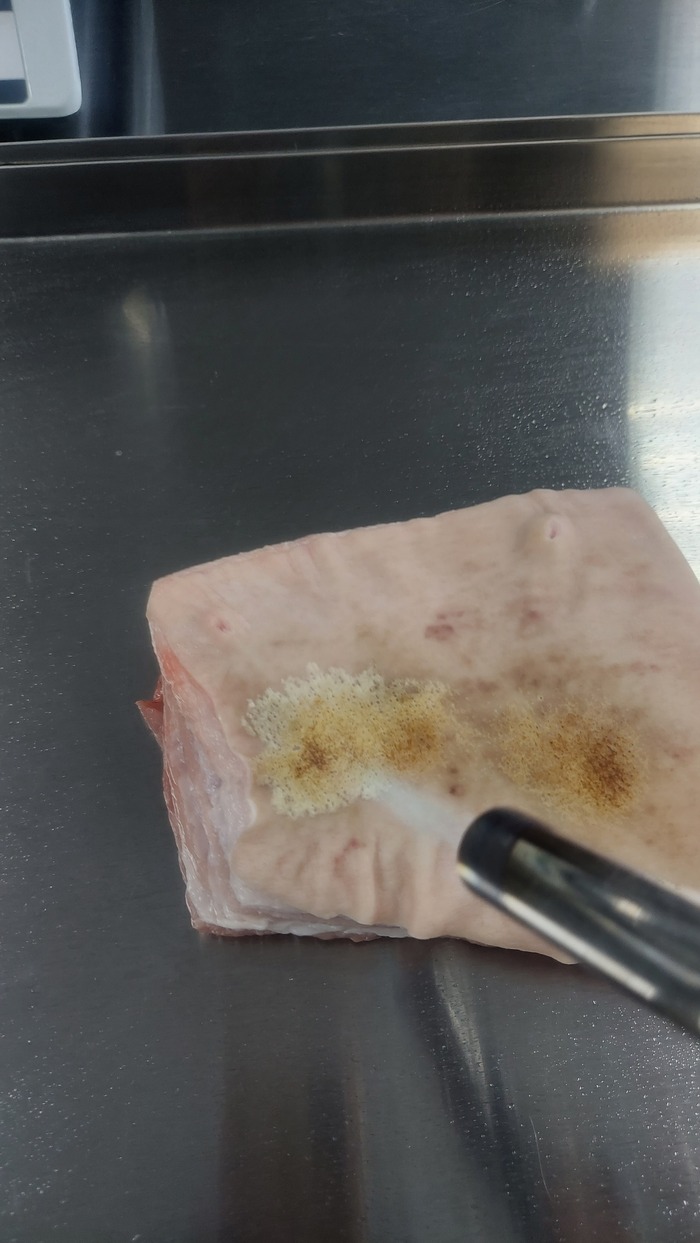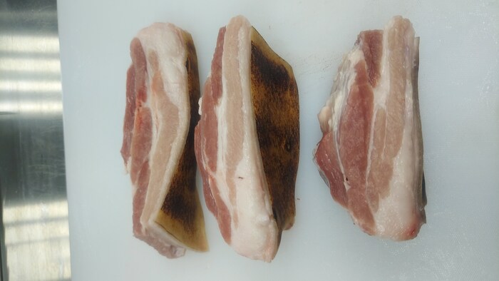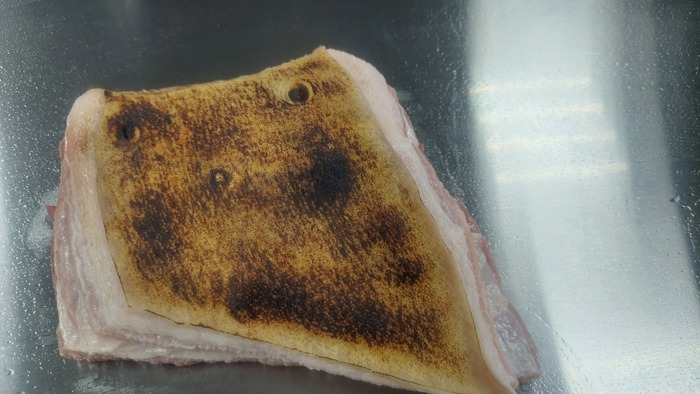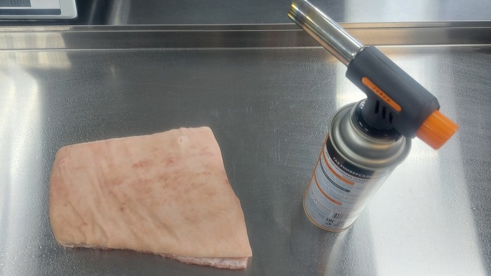 На нижней части мяса у нас есть кожа. Как правило её не едят и перед употреблением срезают. Можно удалить её до засолки, но можно придать салу небольшой аромат бекона. Для этого я использовал газовую горелку.
