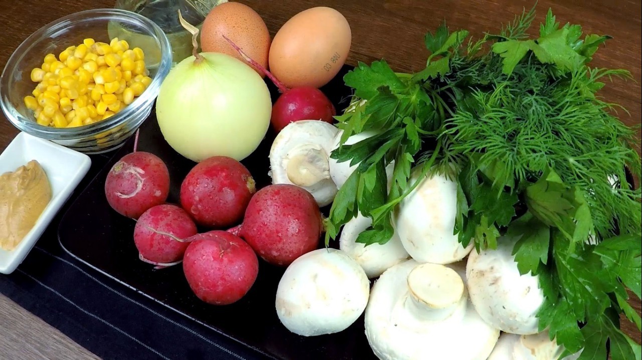 Ингредиенты: Редис- 170 гр.Шампиньоны – 350 гр.Лук репка -1 шт.Кукуруза– 100 гр. Яйца – 2 шт.Зелень -20 гр. (петрушка, укроп)Соль, перец по вкусуРастительное масло для обжарки.Для заправки:Горчица – 1ч.л.Растительное масло –2 ст.л.