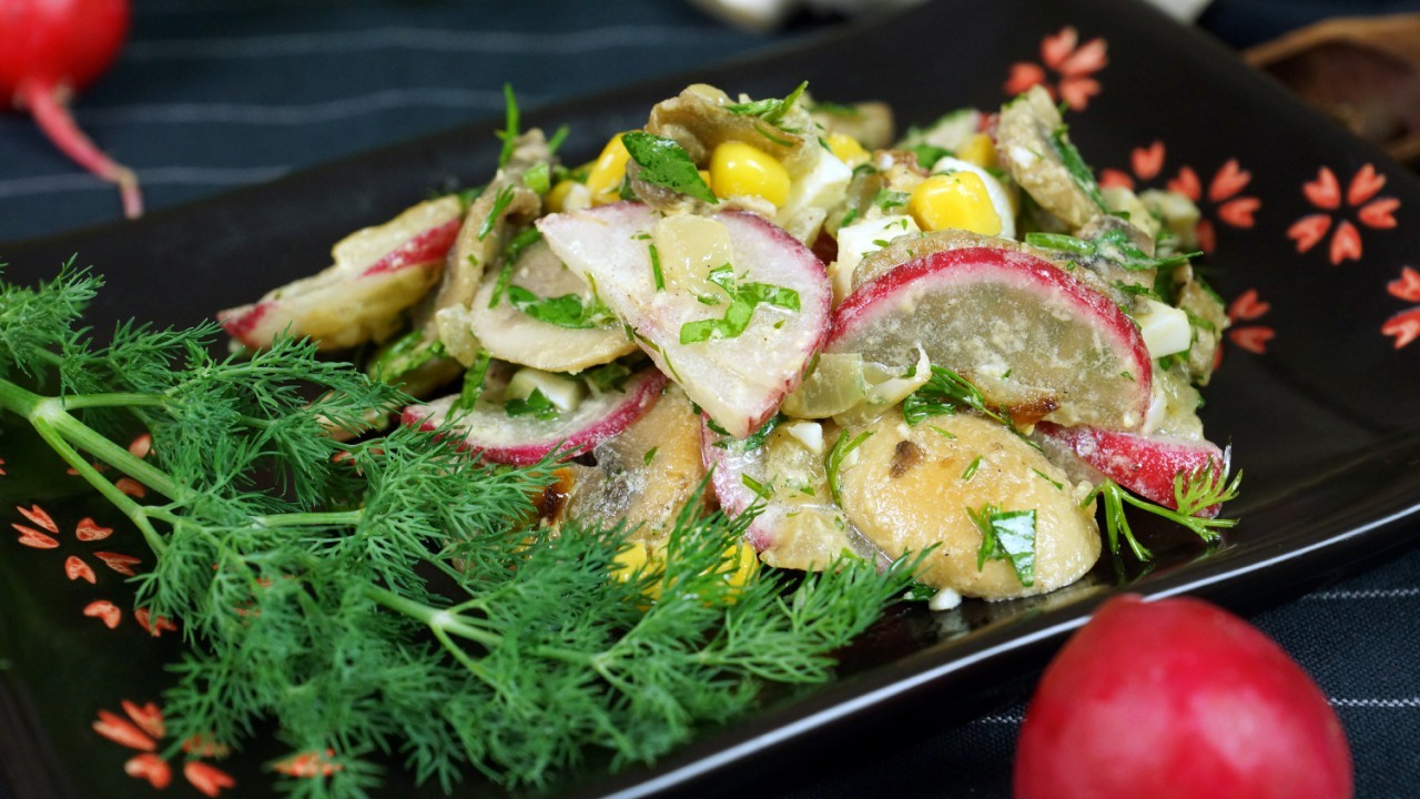 ПОШАГОВОЕ ПРИГОТОВЛЕНИЕ:Подготовить все ингредиенты. Репчатый лук очистить, разрезать пополам, затем на мелкие кубики.В сковородку налить растительное масло, разогреть и добавить лук. Посолить небольшой щепоткой. Обжарить до золотистого цвета. Убрать в емкость.Грибы очистить от мусора не промывая под водой. Нарезать на пластины. Если шампиньоны слишком большие, как у меня, можно каждую пластины разрезать еще пополам. В эту же сковородку подлить растительное масло, выложить грибы и посолить. На среднем огне под крышкой поджарить шампиньоны. Как только грибы начнут отдавать жидкость, снять крышку и жарить 5-7 минут до золотистого цвета. Редиску промыть, удалить хвостики и тоже нарезать на пластины. В сезон она особенна вкусная.Яйца заранее отварить вкрутую, очистить и нарезать на кубики. Свежую зелень промыть и мелко нашинковать. Я взяла укроп и петрушку. Вы же можете воспользоваться любой зеленушкой на ваш вкус.Выложить в глубокую чашу грибы, лук, яйца, редиску, кукурузу и зелень. Хорошо перемешать. Сделать заправку. Для этого к горчице постепенно добавить по 1 ч.л. растительного масла и тщательно перемешать.Добавить заправку к салату и еще раз перемешать.По вкусу добавить соль и черный перец.Такой салат получается очень сытным и вкусным. Легко заменит в жаркую погоду завтрак или ужин. Надеюсь, рецепт был полезен. Приятного Вам аппетита.
