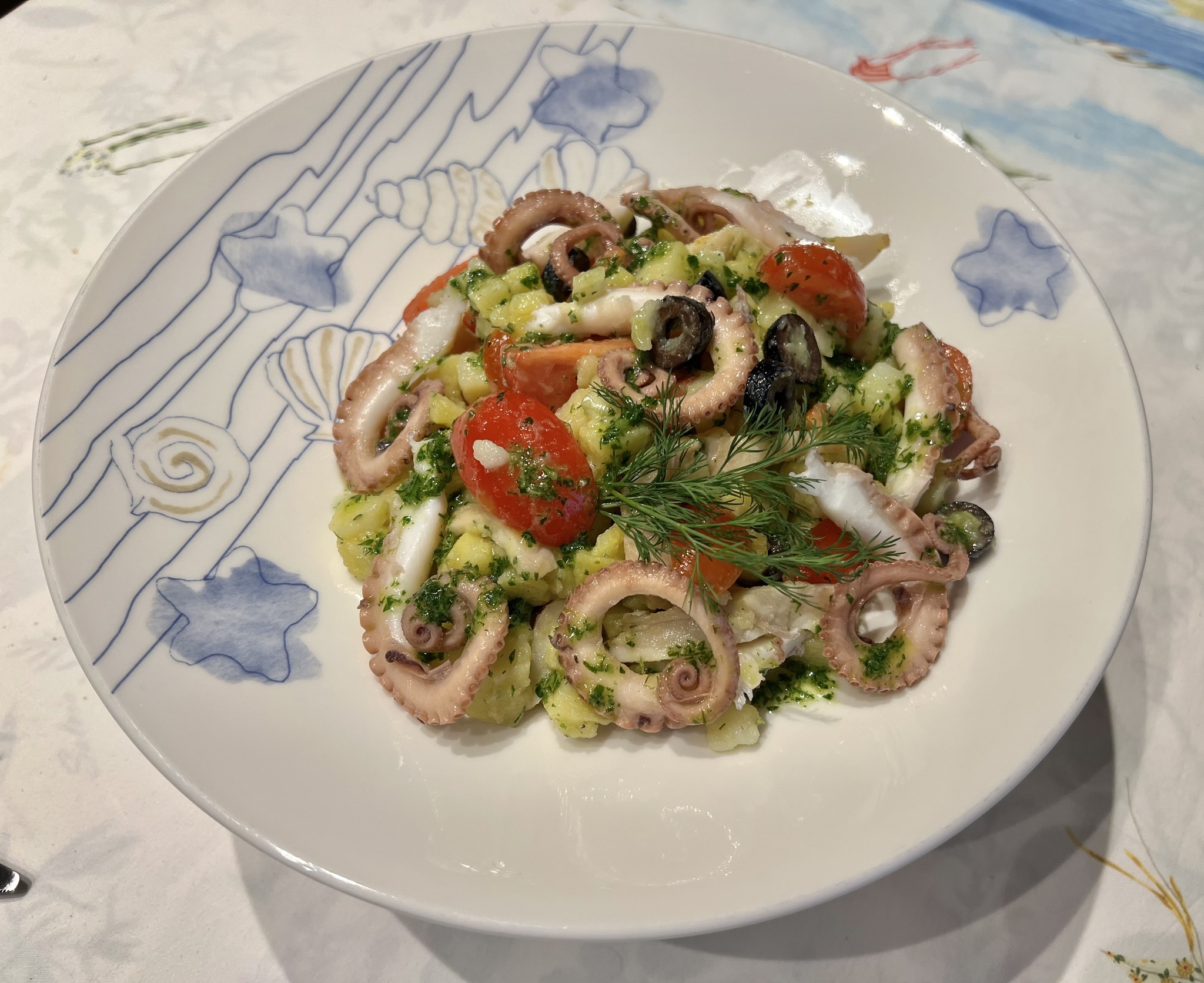 Пожалуй, это сочетание для осьминогов является наиболее распространенным (после простого картофельного салата с зеленью петрушки). Салат прекрасно подходит для легкого ужина.
