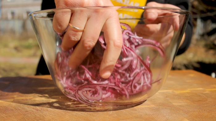 Головку фиолетового лука среднего размера очищаем от шелухи и нарезаем полукольцами. Важно нарезать лук так мелко, как это только возможно. Желательно чтобы он получился практически прозрачным. Перекладываем лук в глубокую миску разделяя полукольца. Добавляем к нему 1 ч.л. сушеного базилика и 1 ст.л. яблочного 6% уксуса. Перемешиваем содержимое миски.