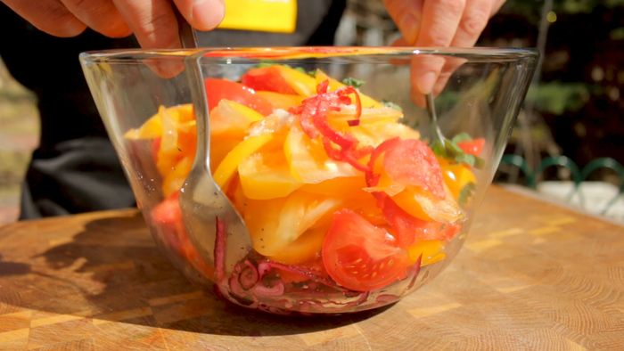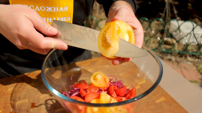 Помидоры 2 цветов разрезаем на 2 части. Удаляем у них плодоножку и нарезаем в салат. Обратите внимание на технику нарезки. Нарезаются помидоры тонкими ломтиками, прямо над тарелкой с луком, чтобы не потерять ни одной капли их сока!