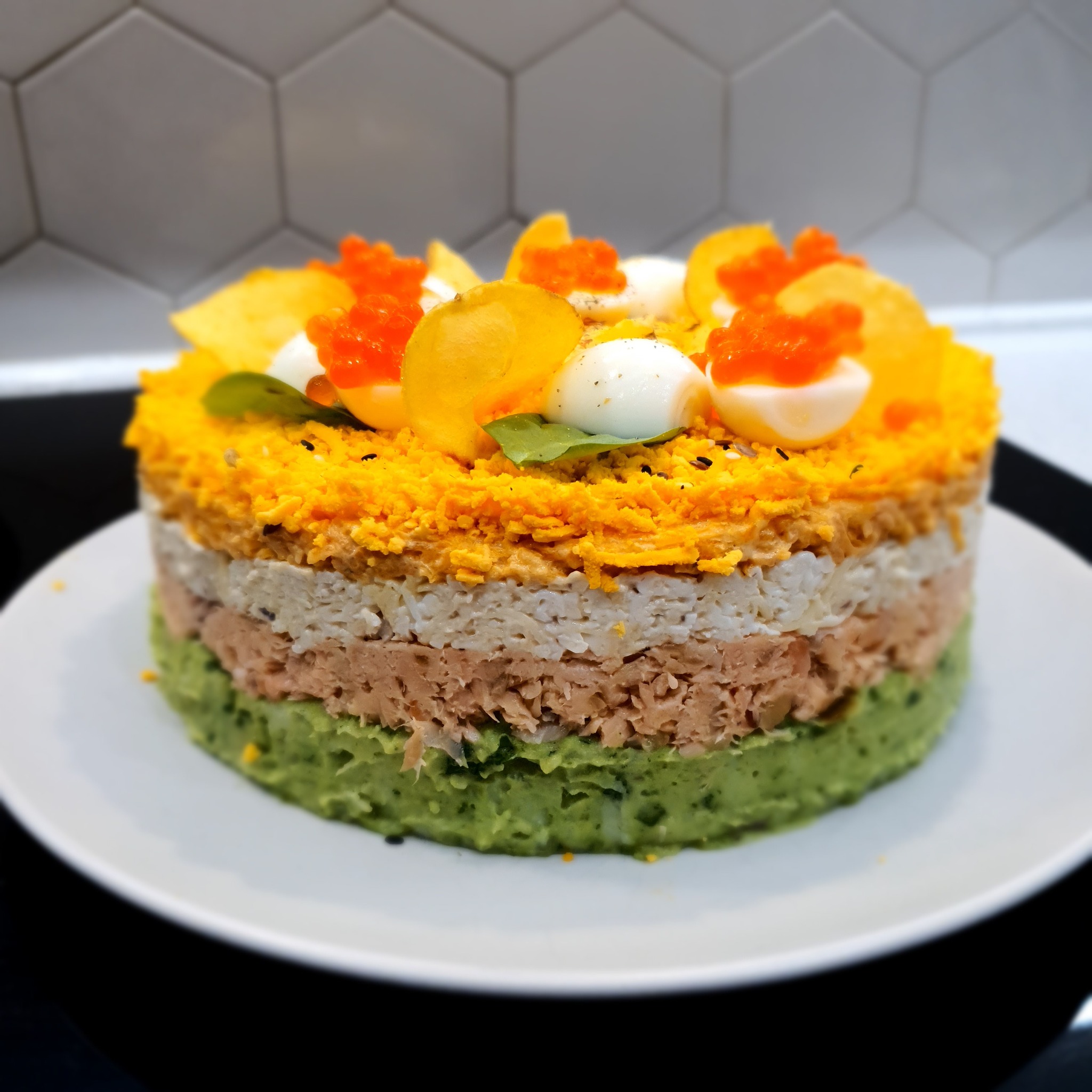 В рецепте от "Работницы" – есть варёная морковь, консервированный лосось меняется на любую рыбную консерву, масло и сыр исчезают, зато майонеза становится ещё больше. И снова никакой картошки.