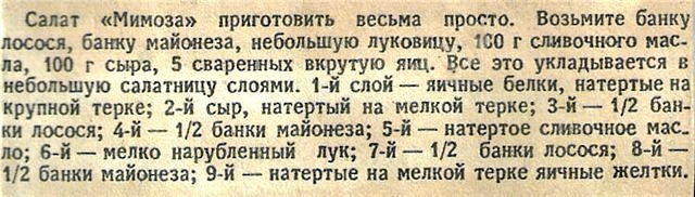 Вот взять, к примеру, привычный всем советский салат "Мимоза". Что мы про него знаем? Назван в честь весеннего цветка, который на самом деле ветка с цветочными метёлками дерева Акация Серебристая. Внезапно, да? Салат бюджетен, лёгок в приготовлении, классический пункт новогоднего меню. Классический ли? Из инета можно узнать, что придуман он всего лишь в конце 70-х прошлого века. Кем придуман? Нет сведений. То ли неким абхазским поваром из столовой советского пансионата то ли каким-то Анонимом из числа советских домохозяек. ГОСТа на него не существует.