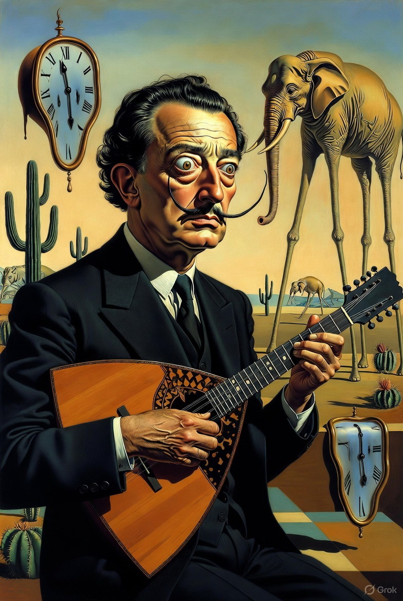 И да, на самом деле этот промт "Salvador Dalí playing a balalaika in a fully surrealistic scene. His iconic curled mustache, elongated shadows, distorted shapes. Elements from his famous works appear around him: melting clocks from “The Persistence of Memory”, tall long-legged elephant-like creatures from “The Elephants”, desert landscapes, fragments from “Dream Caused by the Flight of a Bee”. A mixture of soft melting objects, broken perspective, strong contrasts and dream-like lighting. The balalaika and Dalí’s hands slightly distort as if melting. Vibrant, bizarre, hyper-detailed atmosphere. Painted in Dalí’s style with oil-painting texture, surrealism, deep colors, high realism" для многих нейронок был своеобразным краш-тестом.