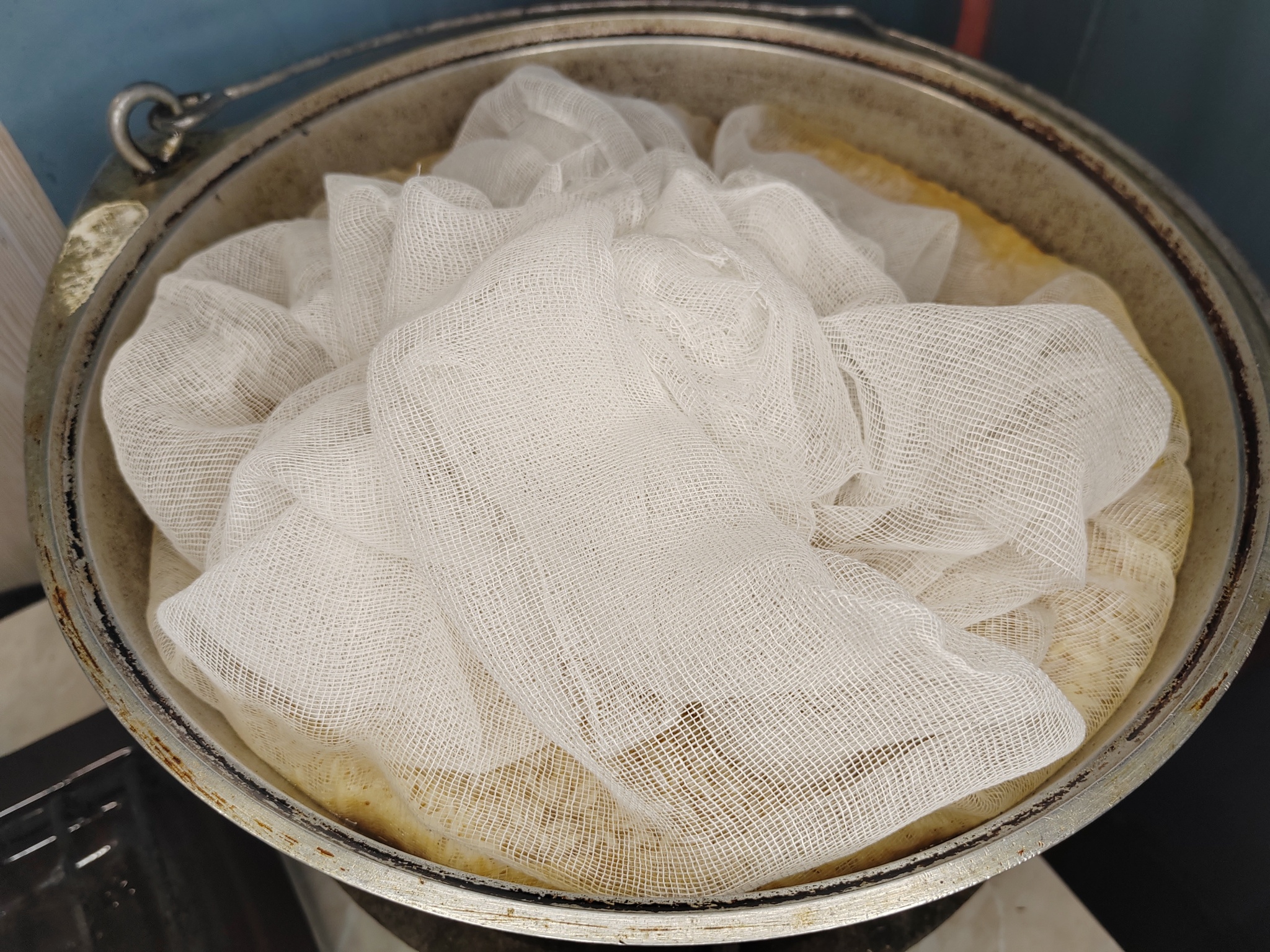 21. После сделаем странное - начнем варить марлю. Или готовить плов с марлей. Или и. В общем, накроем зирвак слоем марли. Следим, чтобы марля внезапно не загорелась. Жидкости в казане останется ещё довольно много - так и должно быть.