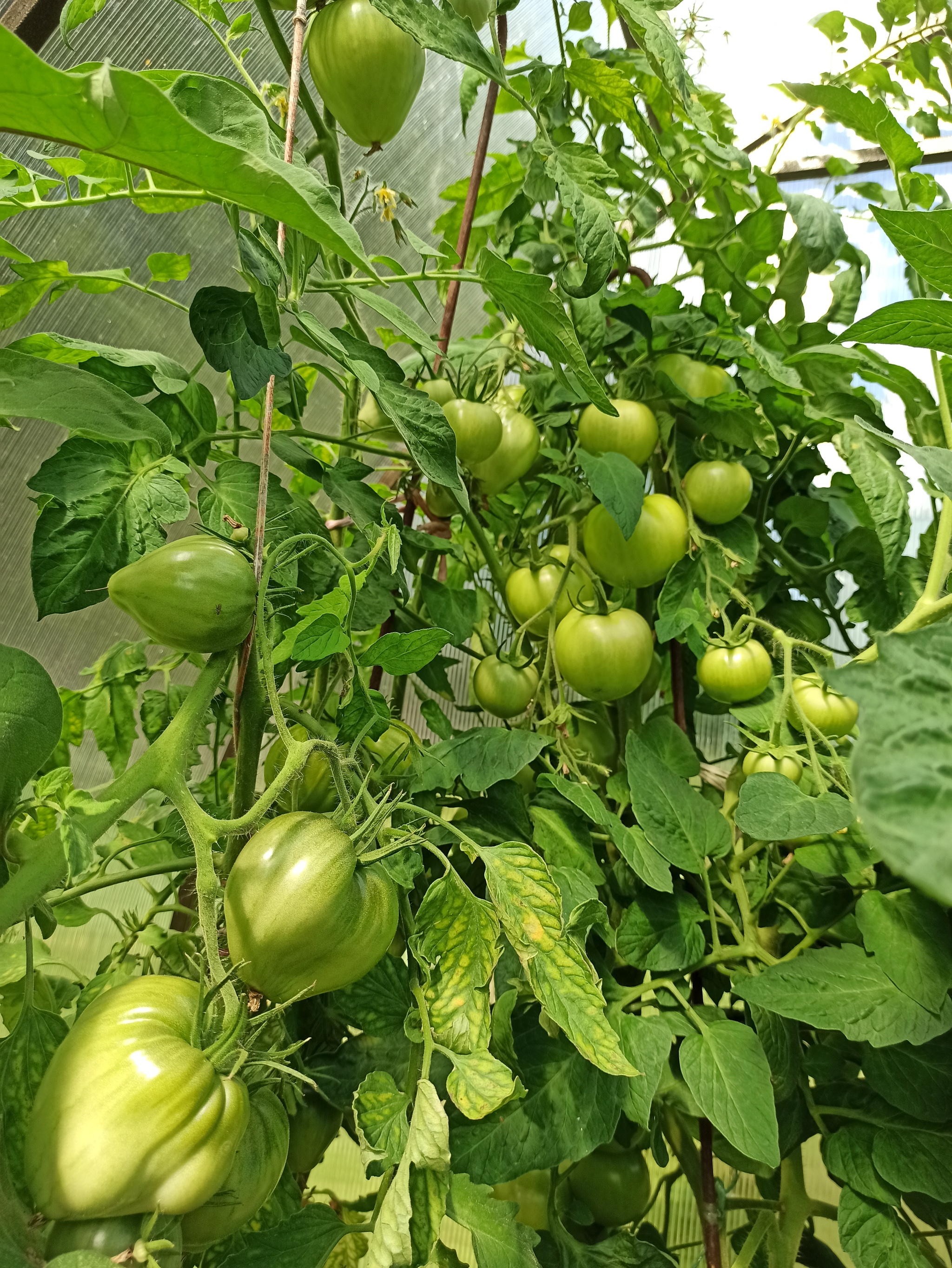 Помидоры в этом году просто огонь, огромные, мясистые и на кусте много. Даже обрезала верхушки, чтобы кусты не сломались. В кой-то веки я пометила кустики и определила несколько сортов, которые буду точно высаживать еще, чтобы помидоры были всё лето (от раннеспелых до поздних).