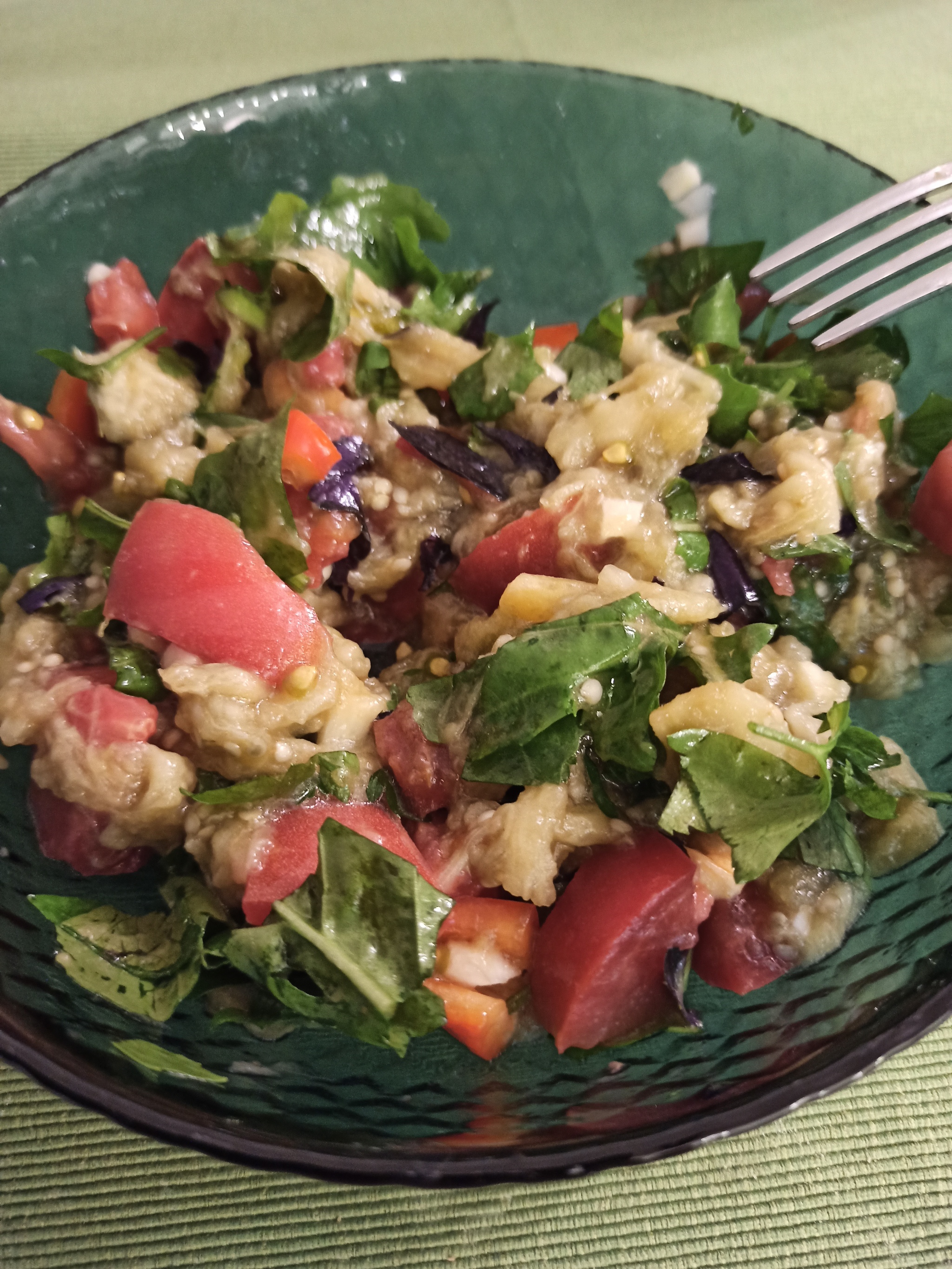 Тут рецептом поделюсь: запеченный баклажан без кожи, чеснок, базилик двух видов (зеленый и фиолетовый), кинза, помидоры, перец и ароматное подсолнечное масло. Да, это даже звучит вкусно!