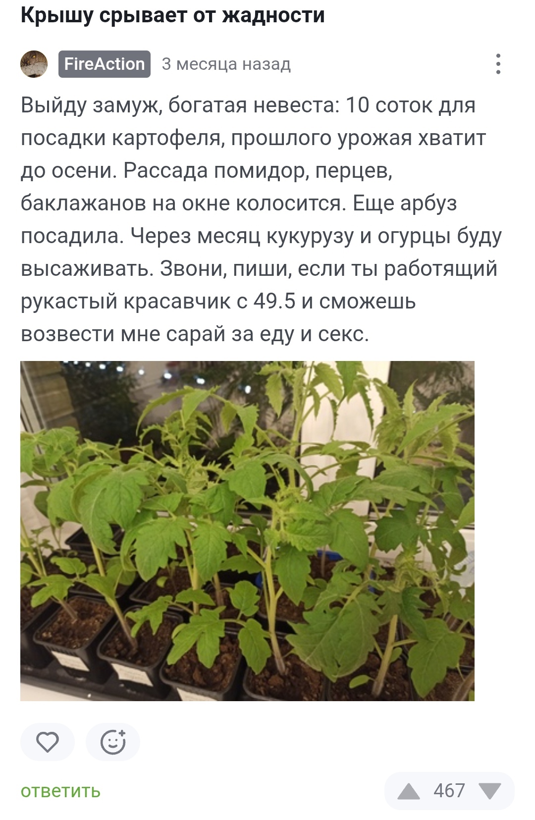 Каждый год я высаживаю какой-то новый вид растения и наблюдаю, как оно растет. Вы спросите "Нахрена, если можно купить в магазине?" Можно. Но мне нравится сам процесс: наблюдать и ухаживать за растениями, видеть, как они, окруженные вниманием и заботой, дают мне свои плоды. Это бесценно!