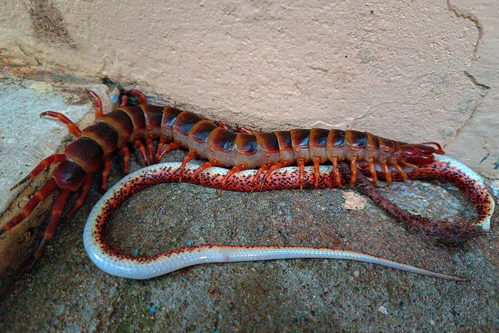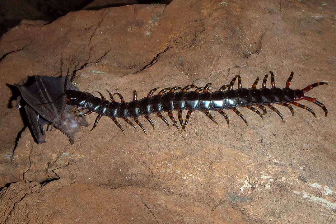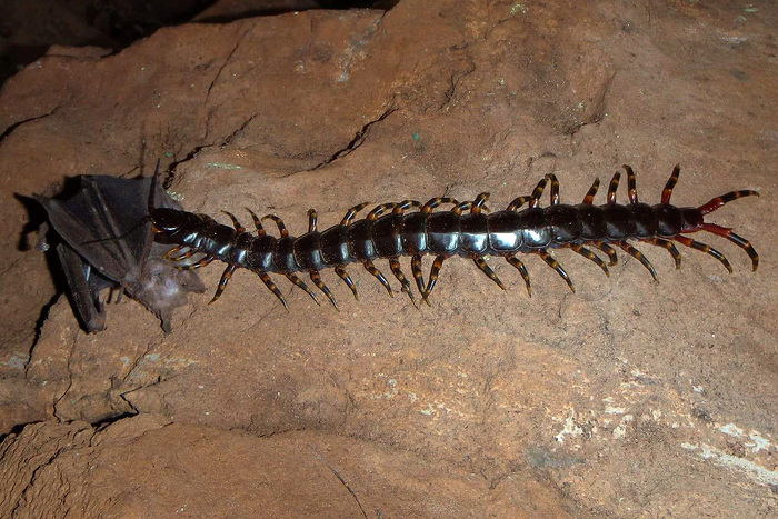 Как вы видите на фото её добычей могут быть не только мелкие беспозвоночные, но и рептилии, амфибии, птицы и млекопитающие, сопоставимые с ней по массе. Летучих мышей гигантская сколопендра ловит забравшись по потолку пещеры. При этом, борясь с жертвой, она может удерживаться лишь на нескольких парах конечностей.