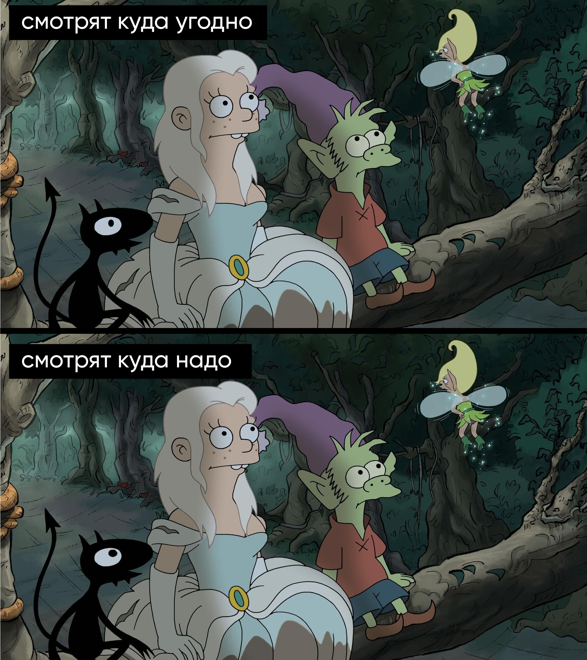 Самое печальное — нет никакого чёткого правила или формулы, по которым каждый может поставить взгляд так как надо, правильно. Аниматор либо видит что персонаж косит или не смотрит в нужную точку, либо не видит. И тогда уже задача ведущего аниматора поставить глаза аниматора правильным образом, чтобы аниматор правильным образом поставил глаза персонажа в кадре.