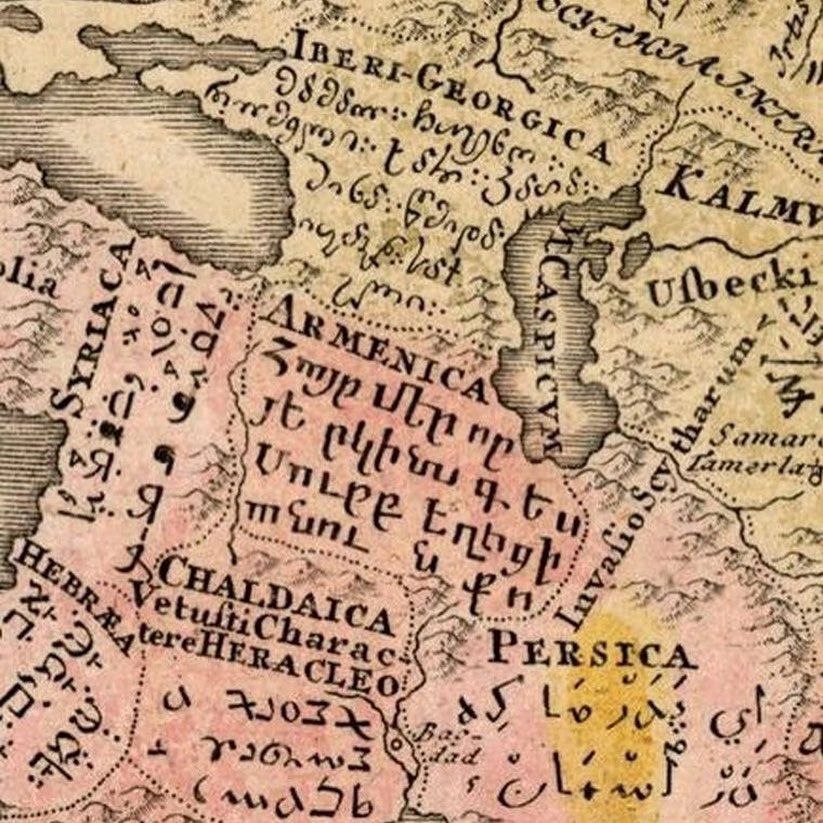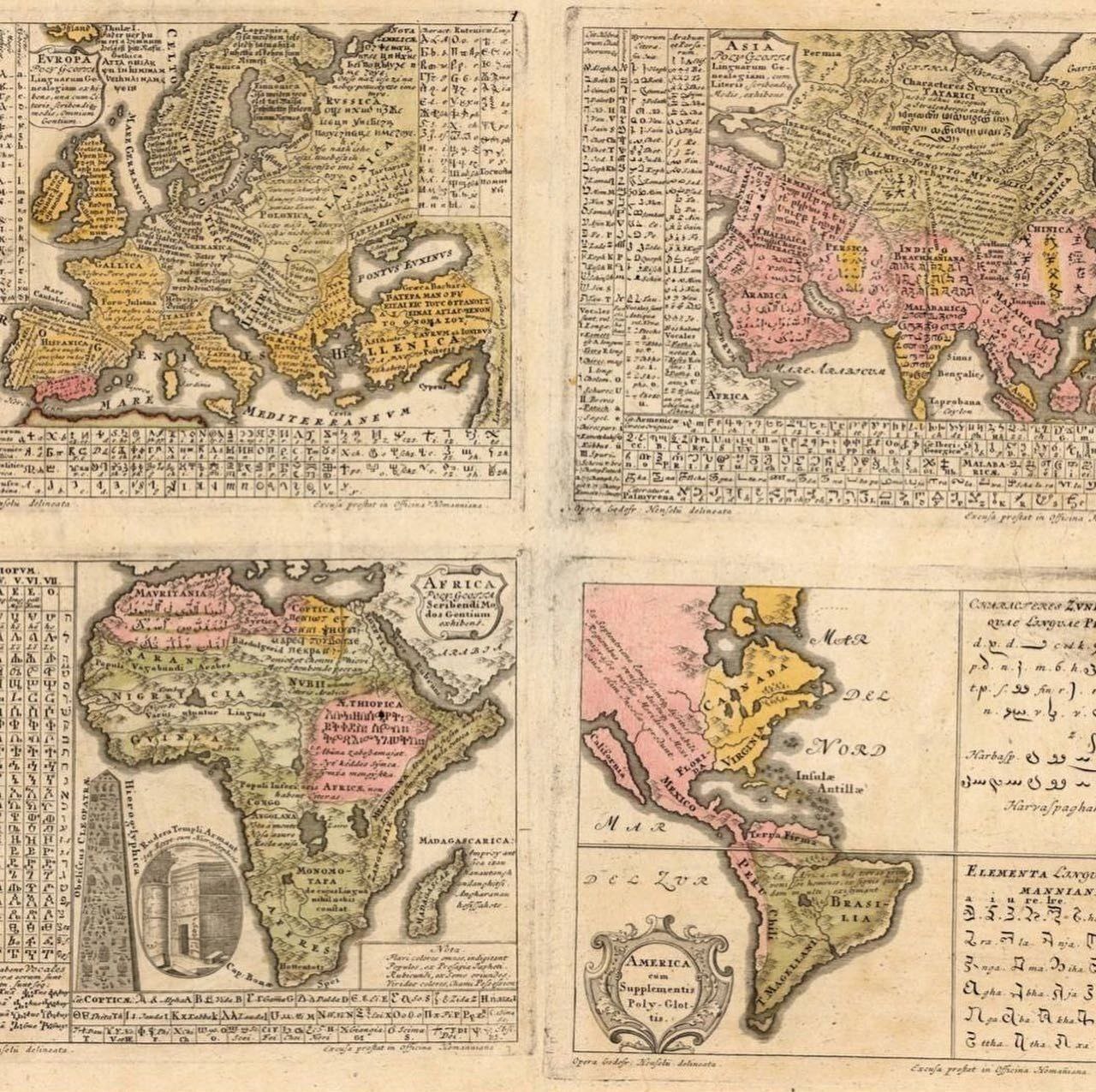 Самая ранняя лингвистическая карта мира, созданная немецким лингвистом Готфридом Хензелем в 1741 году.